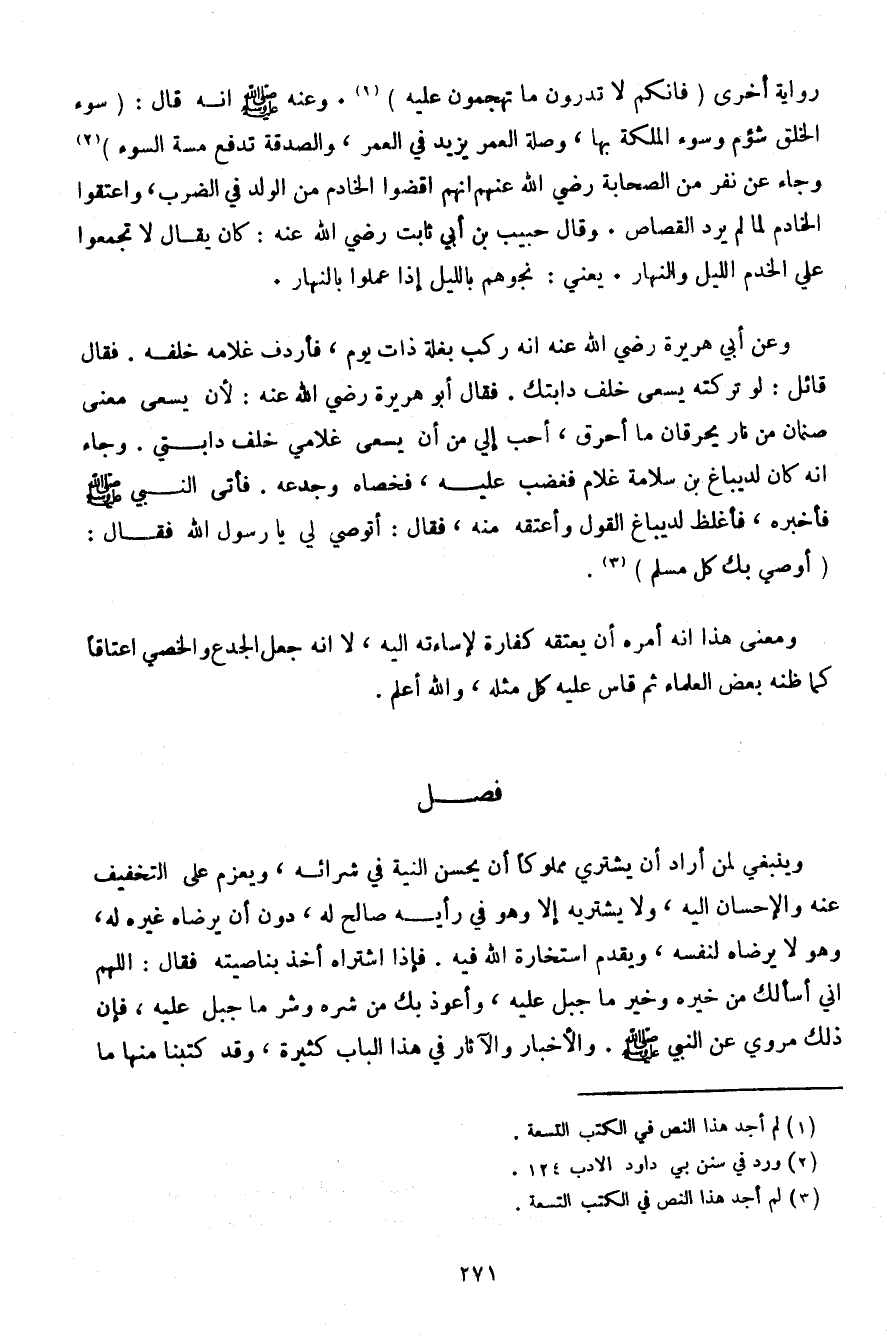 رواية أخرى (فإنكم لا تدرون ما تهجمون عليه). وعنه صلى الله عليه وسلم أنه قال: (سوء الخلق شؤم وسوء الملكة بها، وصلة العمر يزيد في العمر، والصدقة تدفع مسة السوء) وجاء عن نفر بن الصحابة رضي الله عنهم أنهم اقضوا الخادم من الولد في الضرب، واعتقوا الخادم لما لم يرد القصاص. وقال حبيب بن أبي ثابت رضي الله عنه: كان يقال لا تجمعوا علي الخدم الليل والنهار. يعني: نجوهم بالليل إذا عملوا بالنهار.