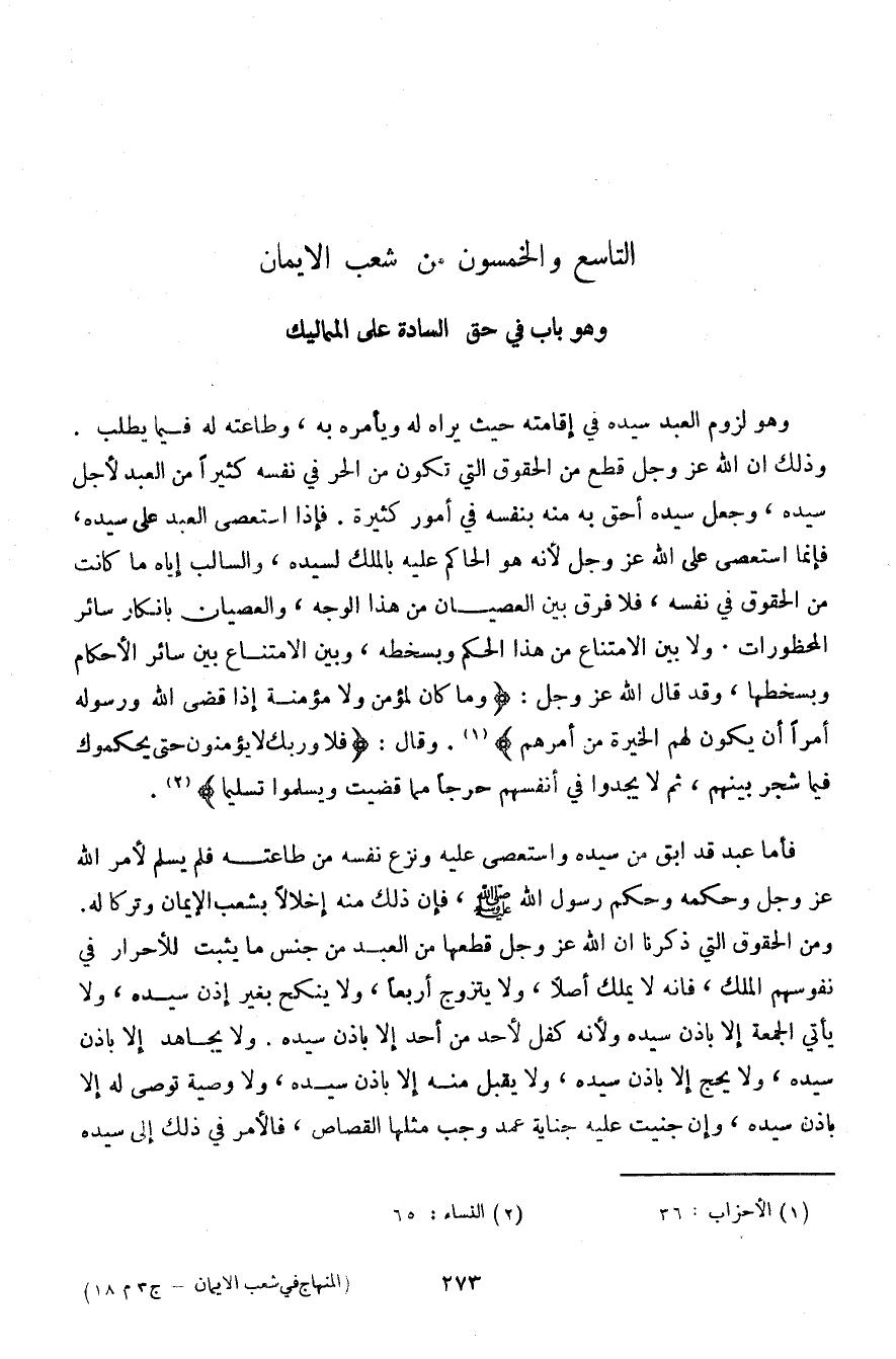 وهو لزوم العبد سيده في إقامته حيث يراه له ويأمره به، وطاعته له فيما يطلب. ولك أن الله عز وجل قطع من الحقوق التي تكون من الحر في نفسه كثيرًا من العبد لأجل سيده، وجعل سيده أحق به منه بنفسه في أمور كثيرة. فإذا استعصى العبد على سيده، فإنما استعصى على الله عز وجل لأنه هو الحاكم عليه بالملك لسيده، والسالب إياه ما كانت من الحقوق في نفسه، فلا فرق بين العصيان من هذا الوجه، والعصيان بإنكار سائر المحظورات. ولا بين الامتناع من هذا الحكم وبسخطه، وبين الامتناع بين سائر الأحكام وبسخطها، وقد قال الله عز وجل: {وما كان لمؤمن ولا مؤمنة إذا قضى الله ورسوله أمرًا أن يكون لهم الخيرة من أمرهم}. وقال: {فلا وربك لا يؤمنون حتى يحكموك فيما شجر بينهم، ثم لا يجدوا في أنفسهم حرجًا مما قضيت ويسلموا تسليمًا}.