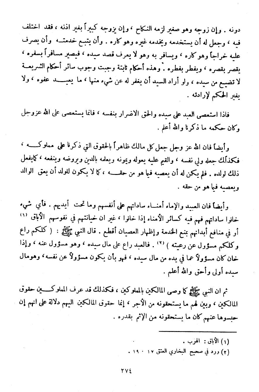 ثم أن النبي صلى الله عليه وسلم كما وصلى المالكين بالمملوكين، فكذلك قد عرف المملوكين حقوق المالكين، وبين لهم ما يستحقونه من الأجر، إنما حقوق المالكين إليهم دلالة على أنهم إن حبسوها عنهم كان ما يستحقونه من الإثم بقدره.