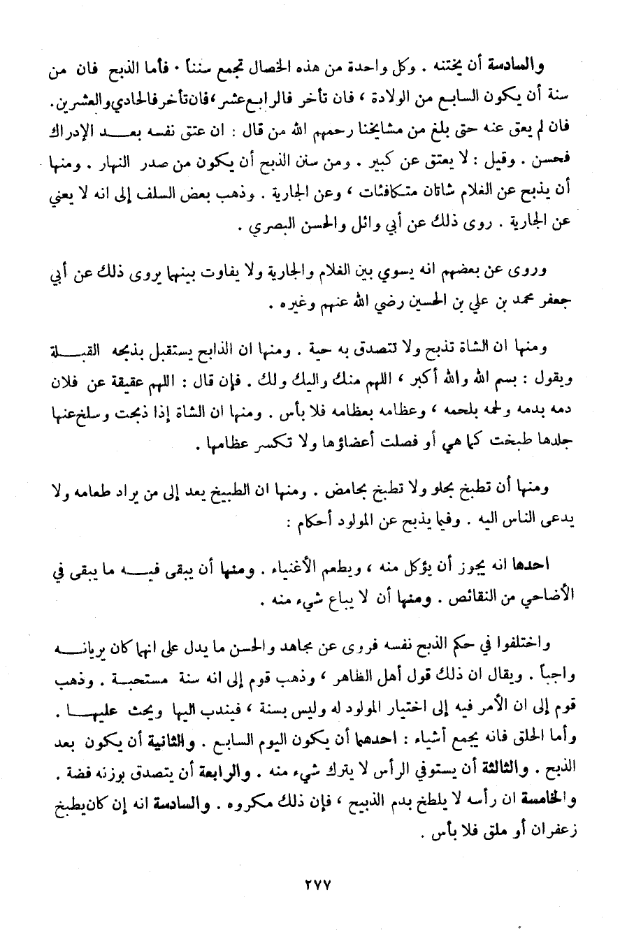 واختلفوا في حكم الذبح نفسه فروى عن مجاهد والحسن ما يدل على أنهما كان يريانه واجبًا. ويقال أن ذلك قول أهل الظاهر، وذهب قوم إلى أنه سنة مستحبة. وذهب قوم إلى أن الأمر فيه إلى اختيار المولود له وليس بسنة، فيندب إليها ويحث عليها. وأما الحلق فإنه يجمع أشياء: أحدهما أن يكون اليوم السابع. والثانية أن يكون بعد الذبح. والثالثة أن يستوفي الرأس لا يترك شيء منه. والرابعة أن يتصدق بوزنه فضة. والخامسة أن رأسه لا يلطخ بدم الذبيح، فإن ذلك مكروه. والسادسة أنه إن كان يطبخ زعفران أو ملق فلا بأس.