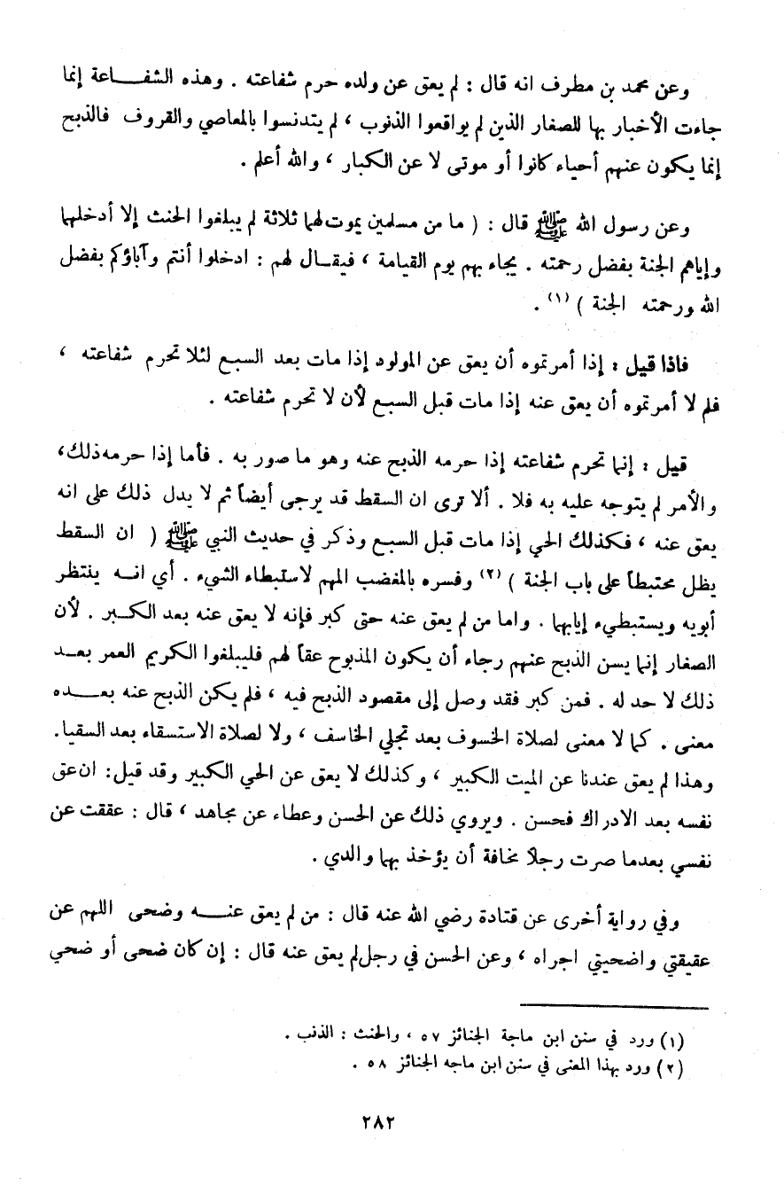 وعن محمد بن مطرف أنه قال: لم يعق عن ولده حرم شفاعته. وهذه الشفاعة إنما جاءت الأخبار بها للصغار الذين لم يواقعوا الذنوب، لم يتدنسوا بالمعاصي والقروف فالذبح إنما يكون عنهم أحياء كانوا أو موتى لا عن الكبار، والله أعلم.