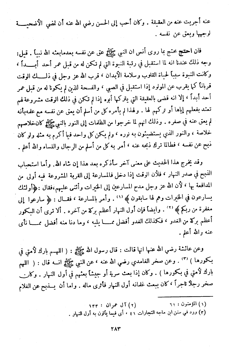 وعن عائشة رضي الله عنها أنها قالت: قال رسول الله صلى الله عليه وسلم: (اللهم بارك لأمتي في بكورها). وعن صخر الغامدي رضي الله عنه، عن النبي صلى الله عليه وسلم أنه قال: (اللهم بارك لأمتي في بكورها). وكان إذا بعث سرية أو جيشًا بعثهم في أول النهار. وكان صخر رجلًا تاجرًا، كان يبعث غلمانه أول النهار فأثرى ماله. وأما أن يذبح عن الغلام