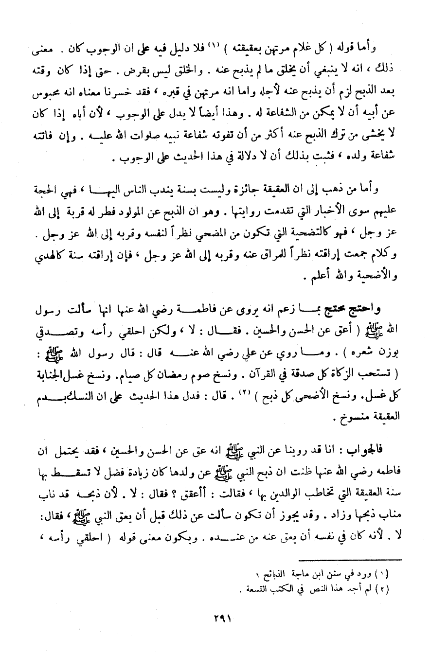 وأما قوله (كل غلام مرتهن بعقيقته) فلا دليل فيه على أن الوجوب كان. معنى ذلك، أنه لا ينبغي أن يخلق ما لم يذبح عنه. والخلق ليس بقرض. حتى إذا كان وقته بعد الذبح لزم أن يذبح عنه لأجله وأما أنه مرتهن في قبره، فقد خسرنا معناه أنه محبوس عن أبيه أن لا يمكن من الشفاعة له. وهذا أيضًا لا يدل على الوجوب، لأن أباه إذا كان لا يخشى من ترك الذبح عنه أكثر من أن تفوته شفاعة نبيه صلوات الله عليه. وإن فاتته شفاعة ولده، فثبت بذلك أن لا دلالة في هذا الحديث على الوجوب.
