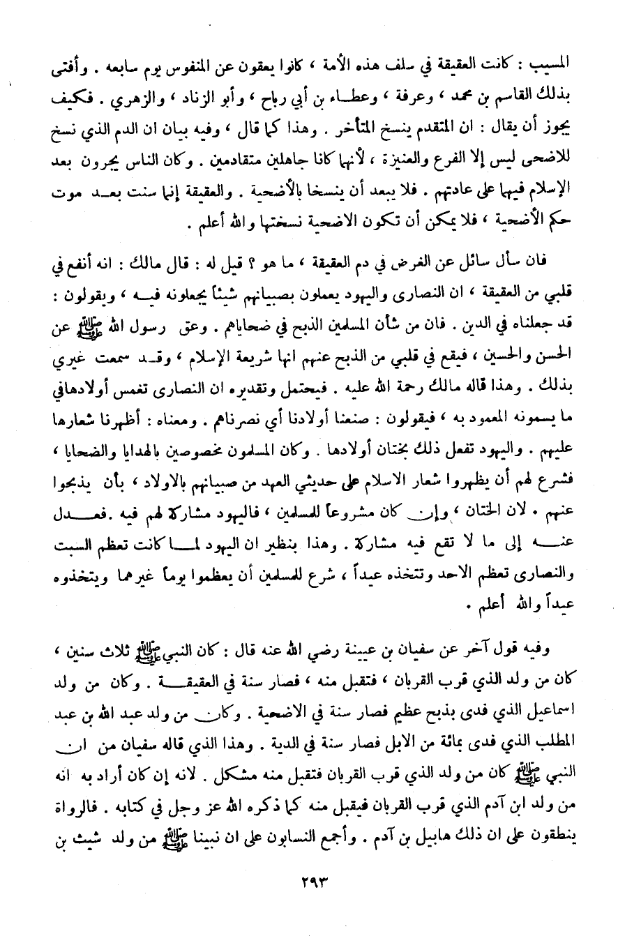 وفيه قول آخر عن سفيان بن عيينة رضي الله عنه قال: كان النبي صلى الله عليه وسلم ثلاث سنين، كان من ولد الذي قرب القربان، فتقبل منه، فصار سنة في العقيقة. وكان من ولد إسماعيل الذي فدى بذبح عظيم فصار سنة في الأضحية. وكان من ولد عبد الله بن عبد المطلب الذي فدى بمائة من الإبل فصار سنة في الدية. وهذا الذي قاله سفيان من أن النبي صلى الله عليه وسلم كان من ولد الذي قرب القربان فتقبل منه مشكل. لأنه إن كان أراد به أنه من ولد ابن آدم الذي قرب القربان فيقبل منه كما ذكره الله عز وجل في كتابه. فالرواة ينطقون على أن ذلك هابيل بن آدم. وأجمع النسابون على أن نبينا صلى الله عليه وسلم من ولد شيث بن
