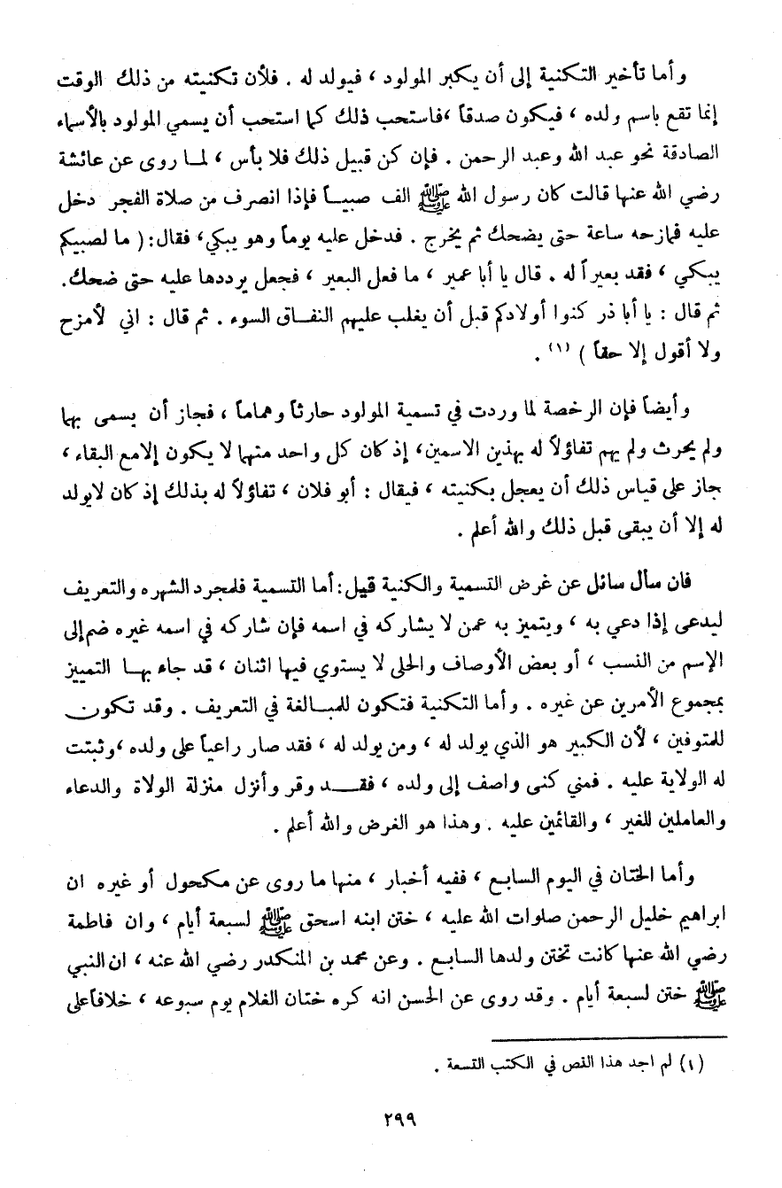 وأما تأخير التكنية إلى أن يكبر المولود، فيولد له. فلأن تكنيته من ذلك الوقت إنما تقع باسم ولده، فيكون صدقًا، فاستحب ذلك كما استحب أن يسمي المولود بالأسماء الصادقة نحو عبد الله وعبد الرحمن. فإن كن قبيل ذلك فلا بأس، لما روى عن عائشة رضي الله عنها قالت كان رسول الله صلى الله عليه وسلم ألف صبيًا فإذا انصرف من صلاة الفجر دخل عليه فمازحه ساعة حتى يضحك ثم يخرج. فدخل عليه يومًا وهو يبكي، فقال: (ما لصبيكم يبكي، فقد بعيرًا له. قال يا أبا عمر، ما فعل البعير، فجعل يرددها عليه حتى ضحك. ثم قال: يا أبا ذر كنوا أولادكم قبل أن يغلب عليهم النفاق السوء. ثم قال: إني لأمزح ولا أقول إلا حقًا).