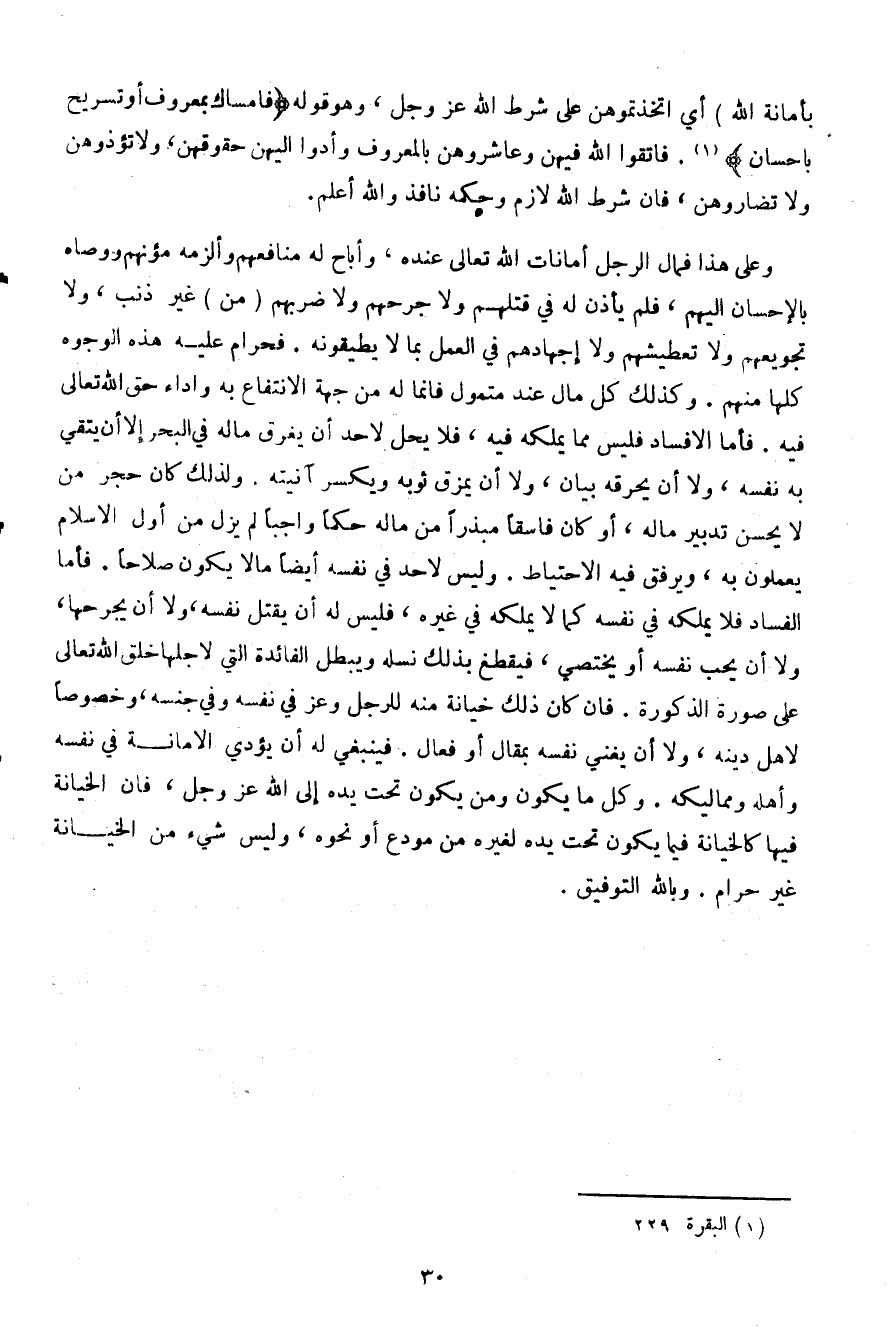 وعلى هذا فمال الرجل أمانات الله تعالى عنده، وأباح له منافعهم وألزمه مؤنهم ووصاه بالإحسان إليهم، فلم يأذن له في قتلهم ولا جرحهم ولا ضربهم (من) غير ذنب، ولا تجويعهم ولا تعطيشهم ولا إجهادهم فبي العمل بما لا يطيقونه. فحرام عليه هذه الوجوه كلها منهم. وكذلك كل مال عند متمول فإنما له من جهة الانتفاع به وأداء حق الله تعالى فيه. فأما الإفساد فليس مما يملكه فيه، فلا يحل لأحد أن يغرق ماله في البحر إلا أن يتقي به نفسه، ولا أن يحرقه بيان، ولا أن يمزق ثوبه ويكسر آنيته. ولذلك كان حجر من لا يحسن تدبير ماله، أو كان فاسقا مبذرا من ماله حكما واجبا لم يزل من أول الإسلام يعملون به، ويرفق فيه الاحتياط. وليس لأحد في نفسه أيضا ما لا يكون صلاحا. فأما الفساد فلا يملكه في نفسه كما لا يملكه في غيره، فليس له أن يقتل نفسه، ولا أن يجرحها، ولا أن يحب نفسه أو يختصي، فيقطع بذلك نسله ويبطل الفائدة التي لأجلها خلق الله تعالى على صورة الذكورة. فإن كان ذلك خيانة منه للرجل وعز في نفسه وفي جنسه، وخصوصا لأهل دينه، ولا أن يغني ننفسه بمقال أو فعال. فينبغي له أن يؤدي الأمانة في نفسه وأهله ومماليكه. وكل ما يكون ومن يكون تحت يده لغيره من مودع أو نحوه، وليس شيء من الخيانة غير حرام. وبالله التوفيق.