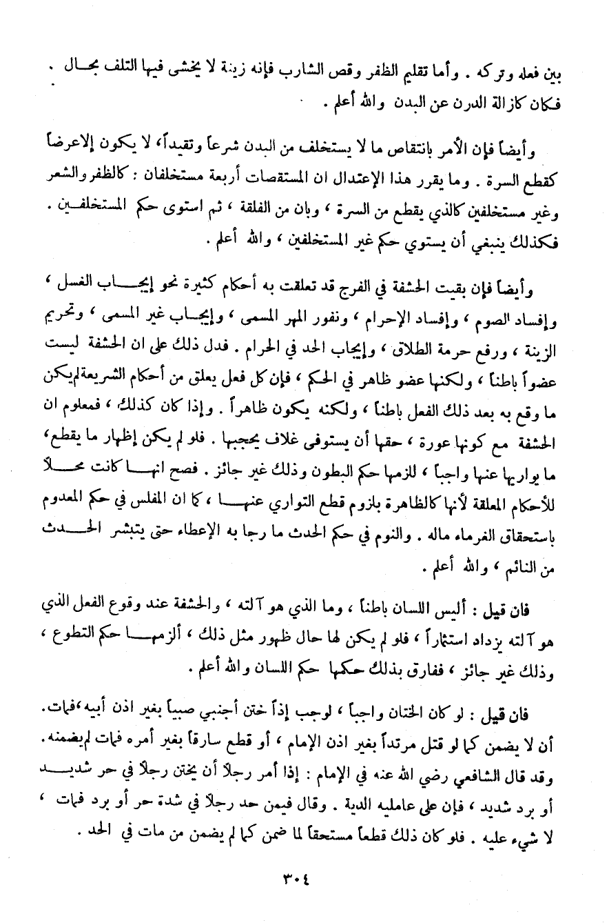 وأيضًا فإن بقيت الحشفة في الرج قد تعلقت به أحكام كثيرة نحو إيجاب الغسل، وإفساد الصوم، وإفساد الإحرام، ونفور المهر المسمى، وإيجاب غير مسمى، وتحريم الزينة، ورفع حرمة الطلاق، وإيجاب الحد في الحرام. فدل ذلك على أن الحشفة ليست عضوًا باطنًا، ولكنها عضوًا ظاهر في الحكم، فإن كل فعل يعلق من أحكام الشريعة لم يكن ما وقع به بعد ذلك الفعل باطنًا، ولكنه يكون ظاهرًا. وإذا كان كذلك، فمعلوم أن الحشفة مع كونها عورة، حقها أن يستوفى غلاف يحجبها. فلو لم يكن إظهار ما يقطع، ما يواريها عنها واجبًا، للزمها حكم البطون وذلك غير جائز. فصح أنها كانت محلًا للأحكام المعلقة لأنها كالظاهرة بلزوم قطع التواري عنها، كما أن المفلس في حكم المعدوم باستحقاق الغرماء ماله. والنوم في حكم الحدث ما رجا به الإعطاء حتى يتبشر الحدث من النائم، والله أعلم.