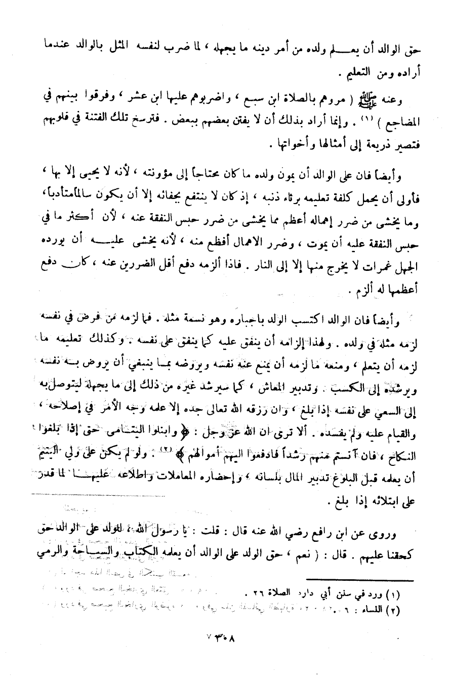 وأيضًا فإن الوالد اكتسب والولد بإجباره وهو نسمة مثله. فما لزمه من فرض في نفسه لزمه مثله في ولده. ولهذا إلزامه أن ينفق عليه كما ينفق على نفسه. وكذلك تعليمه ما لزمه أن يتعلم، ومنعه ما لزمه أن يمنع عنه نفسه ويروضه بما ينبغي أن يروض به نفسه ويرشده إلى الكسب. وتدبير المعاش، كما سيرشد غيره من ذلك إلى ما يجهله ليتوصل به إلى السعي على نفسه إذا بلغ، وإن رزقه الله تعالى جده إلا علمه وجه الأمر في إصلاحه، والقيام عليه ولم يفسده. ألا ترى أن الله عز وجل: {وابتلوا اليتامى حتى إذا بلغوا النكاح، فإن آنستم منهم رشدًا فادفعوا إليهم أموالهم}. ولو لم يكن على ولي اليتيم أن يعلمه قبل البلوغ تدبير المال بلسانه، وإحضاره المعاملات واطلاعه عليها لما قدر على ابتلائه إذا بلغ.