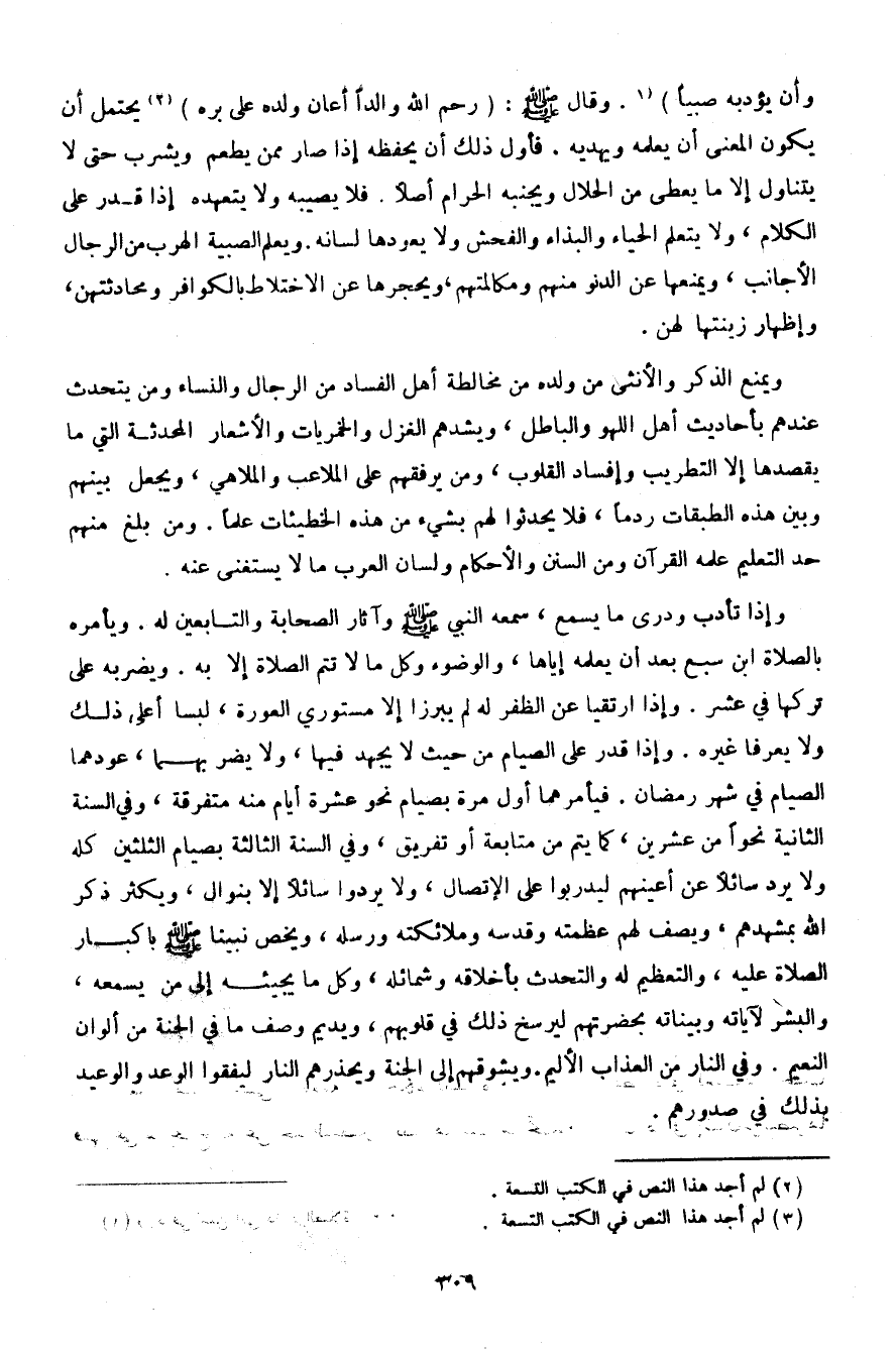 وإذا تأدب ودرى ما يسمع، سمعه النبي صلى الله عليه وسلم وآثار الصحابة والتابعين له. ويأمره بالصلاة ابن سبع بعد أن يعلمه إياها، والوضوء وكل ما لا تتم الصلاة إلا به. ويضربه على تركها في عشر. وإذا ارتقيا عن الظفر له لم يبرزا إلا مستوري العورة، لبسا أعلى ذلك ولا يعرفا غيره. وإذا قدر على الصيام من حيث لا يجهد فيها، ولا يضر بهما، عودهما الصيام في شهر رمضان. فيأمرهما أول مرة بصيام نحو عشرة أيام منه متفرقة، وفي السنة الثانية نحوًا من عشرين، كما يتم من متابعة أو تفريق، وفي السنة الثالثة بصيام الثلثين كله ولا يرد سائلًا عن أعينهم ليدربوا على الاتصال، ولا يردوا سائلًا إلا بنوال، ويكثر ذكر الله بمشهدهم، ويصف لهم عظمته وقدسه وملائكته ورسله، ويخص نبينا صلى الله عليه وسلم باكبار الصلاة عليه، والتعظيم له والتحدث بأخلاقه وشمائله، وكل ما يجيئه إلى من يسمعه، والبشر لآياته وبيناته بحضرتهم ليرسخ ذلك في قلوبهم، ويديم وصف ما في الجنة من ألوان النعيم. وفي النار من العذاب الأليم. ويشوقهم إلى الجنة ويحذرهم النار ليفقوا الوعد والوعيد بذلك في صدورهم.