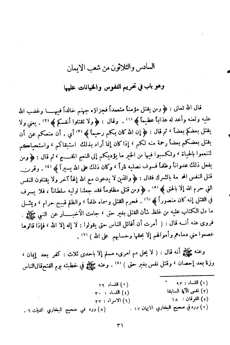 قال الله تعالى:} ومن يقتل مؤمنا متعمدا فجزاؤه جهنم خالدا فيها وغضب الله عليه ولعنه وأعد له عذابا عظيما {. وقال:} ولا تقتلوا أنفسكم {. يعني ولا يقتل بعضكم بعضا، ثم قال:} إن الله كان بكم رحيما {أي. أن منعكم عن أن يقتل بعضكم بعضا رحمة منه لكم، إذا كان إنما أراد بذلك استبقاكم، واستحياكم لتنعموا بالحياة، وتكسبوا فيها من الخير ما يؤديكم إلى النعيم المقيم، ثم قال:} ومن يفعل ذلك عدوانا وظلما فسوف نصليه نارا، وكان ذلك على الله يسيرا {. وقرن قتل النفس المحرمة بالشرك فقال:} والذين لا يدعون مع الله إلها آخر ولا يقتلون النفس التي حرم الله إلا بالحق {.} ومن قتل مظلوما فقد جعلنا لوليه سلطانا، فلا يسرف في القتل إنه كان منصورا {. فحرم القتل وسماه ظلما، والظلم قبيح حرام، ويمثل ما دل الكتاب عليه من غلظ شأن القتل بغير حق، جاءت الأخبار عن النبي صلى الله عليه وسلم. فروى عنه أنه قال: (أمرت أن أقاتل الناس حتى يقولوا: لا إله إلا الله، فإذا قالوها عصموا مني دماءهم وأموالهم إلا بحقها وحسابهم على الله).