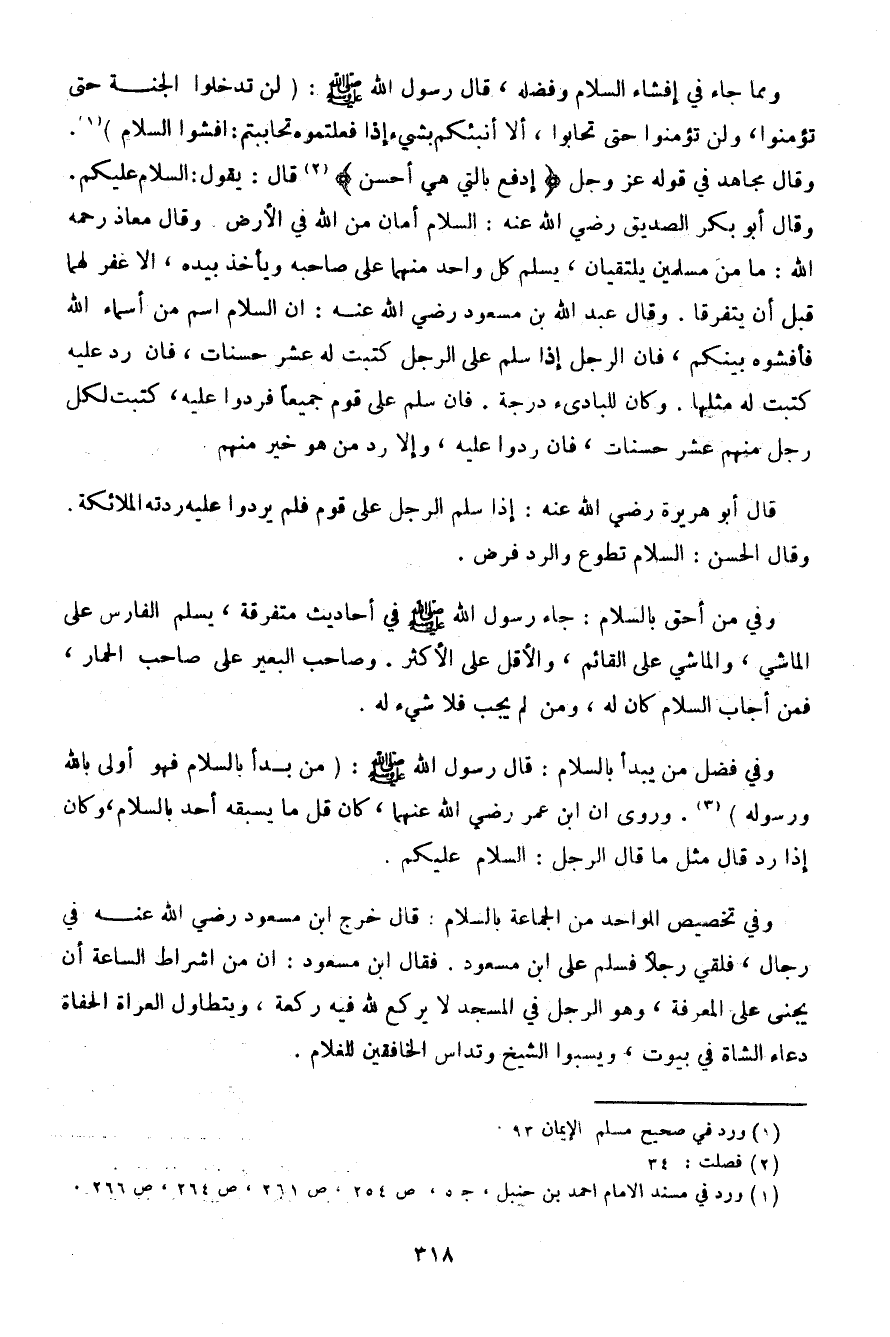 ومما جاء في إفشاء السلام وفضله، قال رسول الله صلى الله عليه وسلم: (لن تدخلوا الجنة حتى تؤمنوا، ولن تؤمنوا حتى تحابوا، ألا أنبئكم بشيء إذا فعلتموه تحاببتم: أفشوا السلام). وقال مجاهد في قوله عز وجل {ادفع بالتي هي أحسن} قال: يقول: السلام عليكم. وقال أبو بكر الصديق رضي الله عنه: السلام أمان من الله في الأرض. وقال معاذ رحمه الله: ما من مسلمين يلتقيان، يسلم كل واحد مهما على صاحبه ويأخذه بيده، إلا غفر لهما قبل أن يتفرقا. وقال عبد الله بن مسعود رضي الله عنه: إن السلام اسم من أسماء الله فأفشوه بينكم، فإن الرجل إذا سلم على الرجل كتبت له عشر حسنات، فإن رد عليه كتبت له مثلها. وكان للبادئ درجة. فإن سلم على قوم جميعًا فردوا عليه، كتبت لكل رجل منهم عشر حسنات، فإن ردوا عليه، وإلا رد من هو خير منهم.