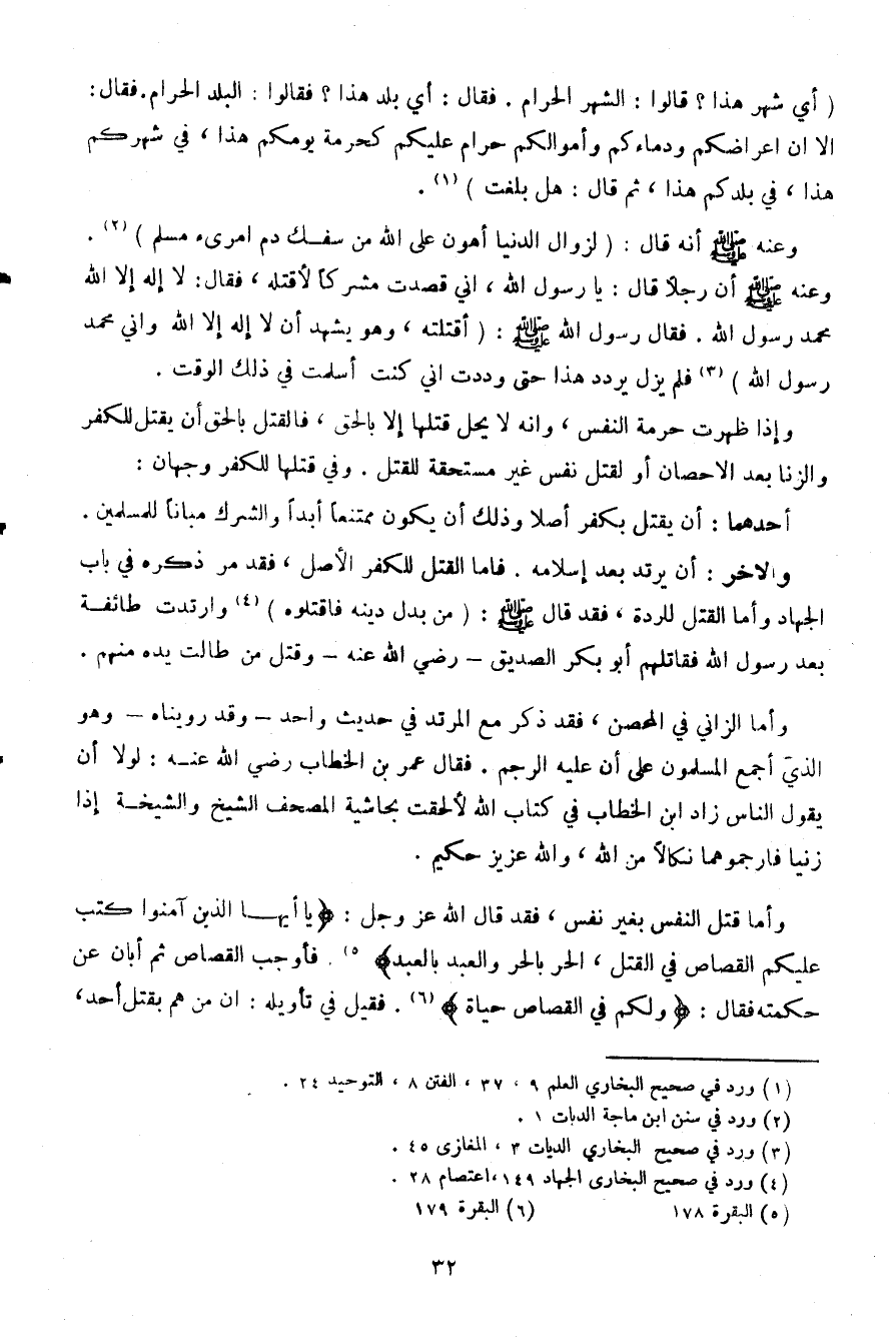 وعنه صلى الله عليه وسلم أنه قال: (لزوال الدنيا أهون على الله من سفك دم امرئ مسلم). وعنه صلى الله عليه وسلم أن رجلا قال: يا رسول الله، إني قصدت مشركا لأقتله، فقال: لا إله إلا الله محمد رسول الله. فقال رسول الله صلى الله عليه وسلم: (أقتلته، وهو يشهد أن لا إله إلا الله وإني محمد رسول الله) فلم يزل يردد هذا حتى وددت إني كنت أسلمت في ذلك الوقت.