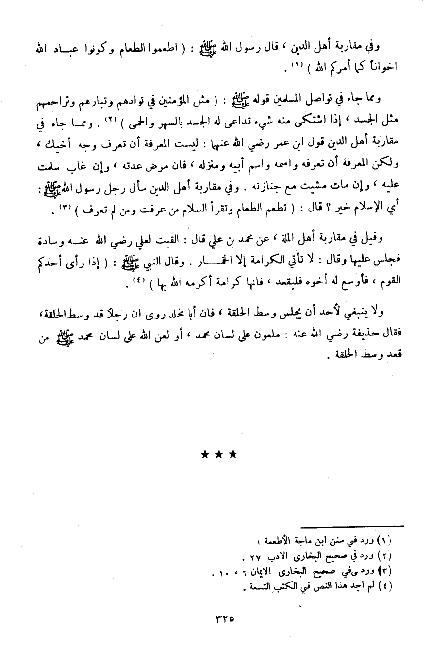 ومما جاء في تواصل المسلمين قوله صلى الله عليه وسلم: (مثل المؤمنين في توادهم وتبارهم وتراحمهم مثل الجسد، إذا اشتكى منه شيء تداعى له الجسد بالسهر والحمى). ومما جاء في مقاربة أهل الدين قول ابن عمر رضي الله عنهما: ليست المعرفة أن تعرف وجه أخيك، ولكن المعرفة أن تعرفه واسمه واسم أبيه ومنزله، فإن مرض عدته، وإن غاب سلمت عليه، وإن مات مشيت مع جنازته. وفي مقاربة أهل الدين سأل رسول الله صلى الله عليه وسلم: أي الإسلام خير؟ قال: (تطعم الطعام وتقرأ السلام من عرفت ومن لم تعرف).