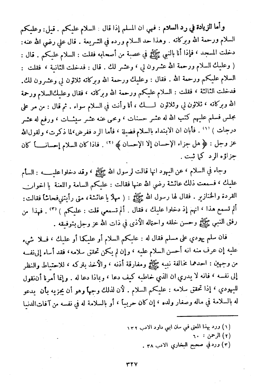 وأما للزيادة في رد السلام: فهي أن المسلم إذا قال: السلام عليكم. قيل: وعليكم السلام ورحمة الله وبركاته. وهذا حد السلام ورده في الشريعة. قال علي رضي الله عنه: دخلت المسجد: فإذا أنا بالنبي صلى الله عليه وسلم في عصبة من أصحابه فقلت: السلام عليكم. قال: (وعليك السلام ورحمة الله عشرون لي، وعشر لك. قال: فدخلت الثانية، فقلت: السلام عليكم ورحمة الله. فقال: وعليك ورحمة الله وبركاته ثلاثون لي وعشرون لك. فدخلت الثالثة، فقتل: السلام عليكم ورحمة الله وبركاته، فقال وعليك السلام ورحمة الله وبركاته، ثلاثون لي وثلاثون لك، أنا وأنت في السلام سواء. ثم قال: من مر على مجلس فسلم عليهم كتب الله له عشر حسنات، ومحى عنه عشر سيئات، ورفع له عشر درجات). فأبان أن الابتداء بالسلام فضيلة، فأما الرد ففرض، فما ذكرت، ولقول الله عز وجل: {هل جزاء الإحسان إلا الإحسان}. فإذا كان السلام إحسانًا كان جزاؤه الرد كما ثبت.