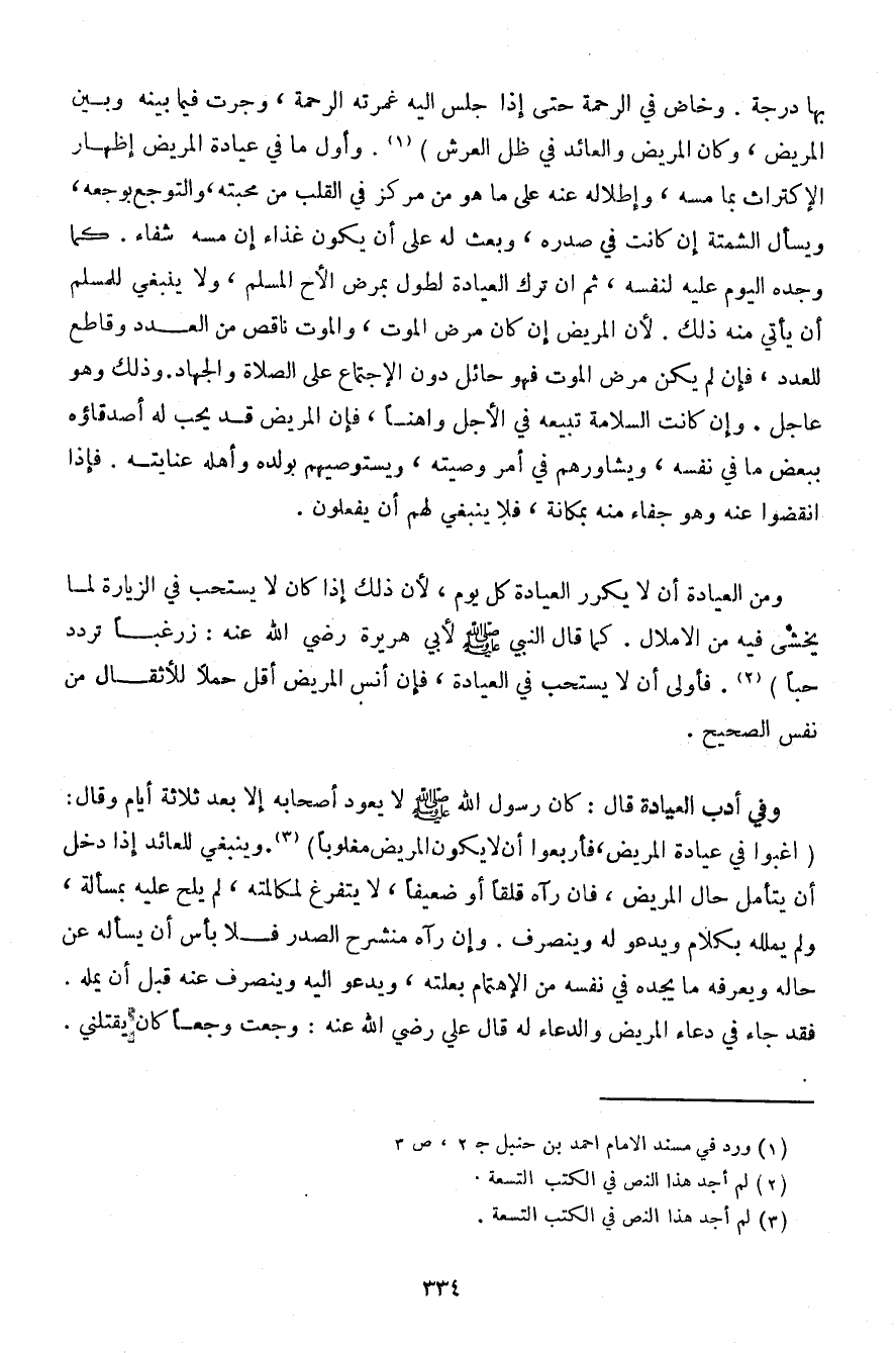 بها درجة. وخاض في الرحمة حتى إذا جلس إليه غمرته الرحمة، وجرت فيما بينه وبين المريض، وكان المريض والعائد في ظل العرش). وأول ما في عيادة المريض إظهار الاكتراث بما مسه، وإطلاله عنه على ما هو من مركز في القلب من محبته، والتوجع بوجعه، ويسأل الشمتة إن كان في صدره، وبعث له على أن يكون غذاء إن مسه شفاء. كما وجده اليوم عليه لنفسه، ثم إن ترك العيادة لطول بمرض الأخ المسلم، ولا ينبغي للمسلم أن يأتي منه ذلك. لأن المريض إن كان مرض الموت، والموت ناقص من العدد وقاطع للعدد، فإن لم يكن مرض الموت فهو حائل دون الاجتماع على الصلاة والجهاد. وذلك وهو عاجل. وإن كانت السلامة تبيعه في الأجل واهنًا، فإن المريض قد يحب له أصدقاؤه ببعض ما في نفسه، ويشاورهم في مر وصيته، ويستوصيهم بولده وأهله عنايته. فإذا انقضوا عنه وهو جفاء منه بمكانة، فلا ينبغي لهم أن يفعلون.