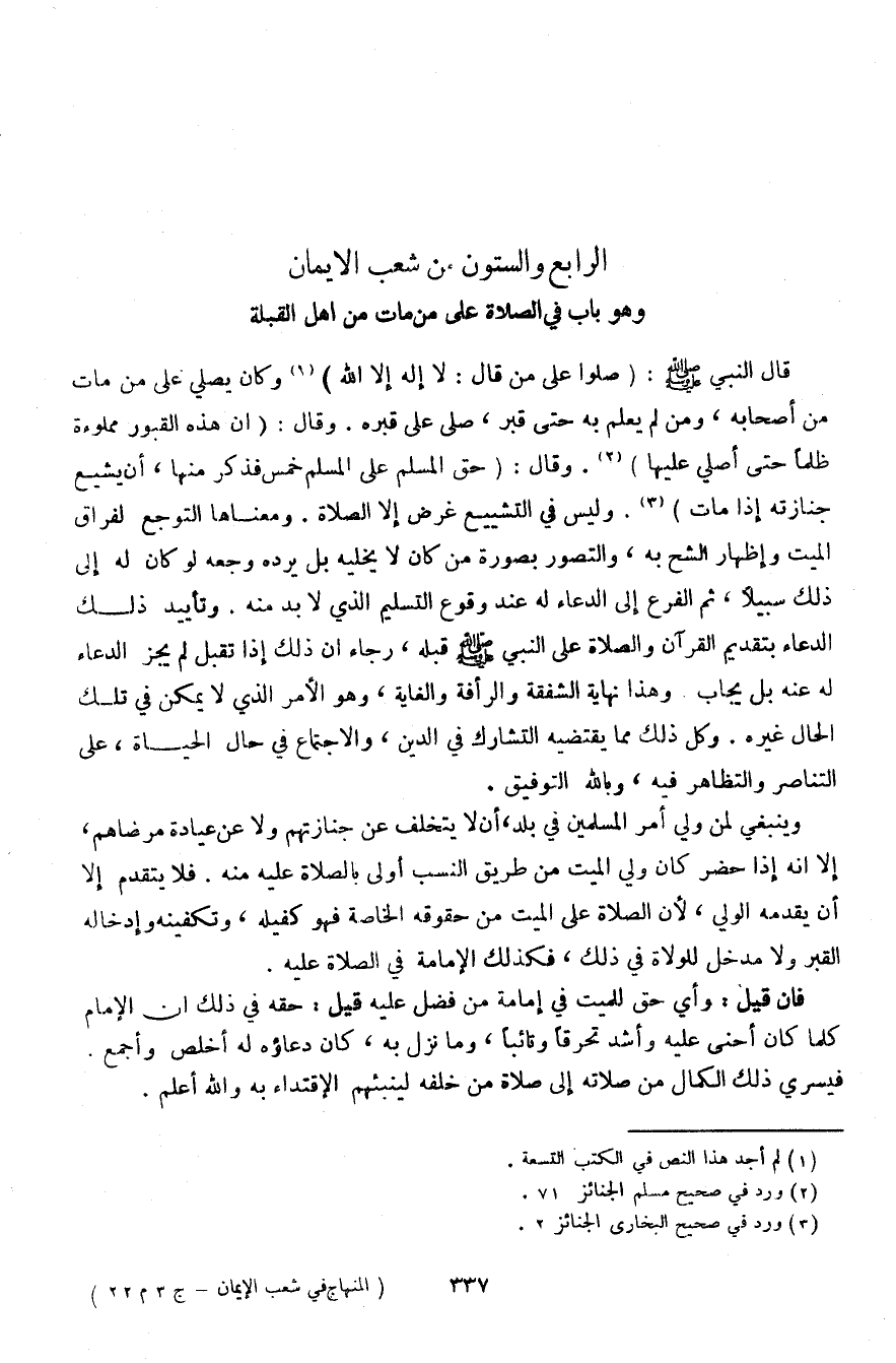 قال النبي صلى الله عليه وسلم: (صلوا على من قال: لا إله إلا الله) وكان يصلي على من مات من أصحابه، ومن لم يعلم به حتى قبر، صلى على قبره. قوال: (إن هذه القبور مملوءة ظلمًا حتى أصلي عليها). وقال: (حق المسلم على المسلم خمس فذكر منها، أن يشيع جنازته إذا مات). وليس في التشييع غرض إلا الصلاة. ومعناها التوجع لفراق الميت وإظهار الشح به، والتصور بصورة من كان لا يخليه بل يرده وجعه لو كان له إلى ذلك سبيلًا، ثم الفرع إلى الدعاء له عند وقوع التسليم الذي لابد منه. وتأييد ذلك الدعاء بتقديم القرآن والصلاة على النبي صلى الله عليه وسلم قبله، رجاء أن ذلك إذا تقبل لم يجز الدعاء له عنه بل يجاب. وهذا نهاية الشفقة والرأفة والغاية، وهو الأمر الذي لا يمكن في تلك الحال غيره. وكل ذلك مما يقتضيه التشارك في الدين، والاجتماع في حال الحياة، على التناصر والتظاهر فيه، وبالله التوفيق.