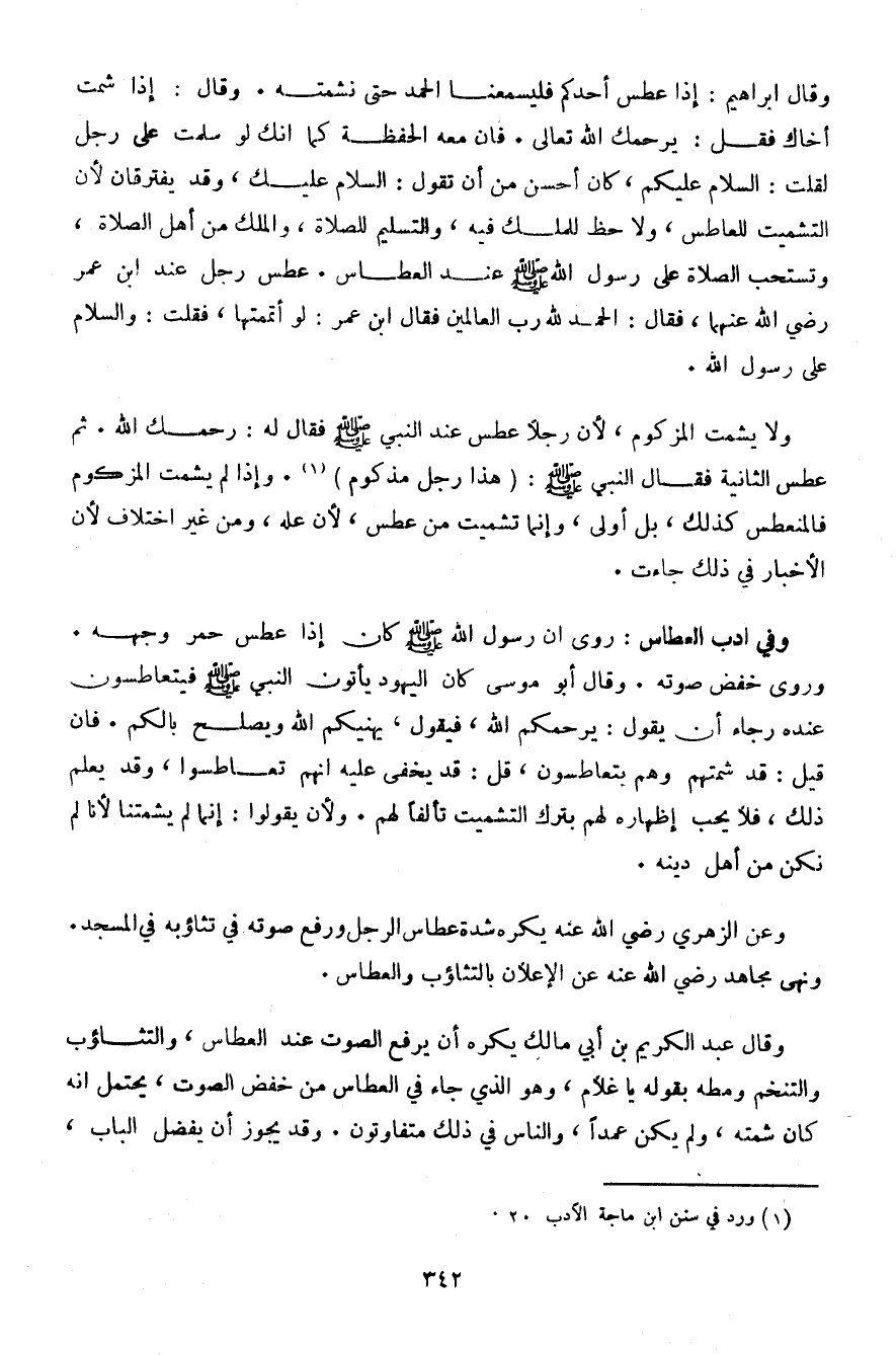 وعن الزهري رضي الله عنه يكره شدة عطاس الرجل ورفع صوته في تثاؤبه في المسجد. ونهى مجاهد رضي الله عنه عن الإعلان بالتثاؤب والعطاس.