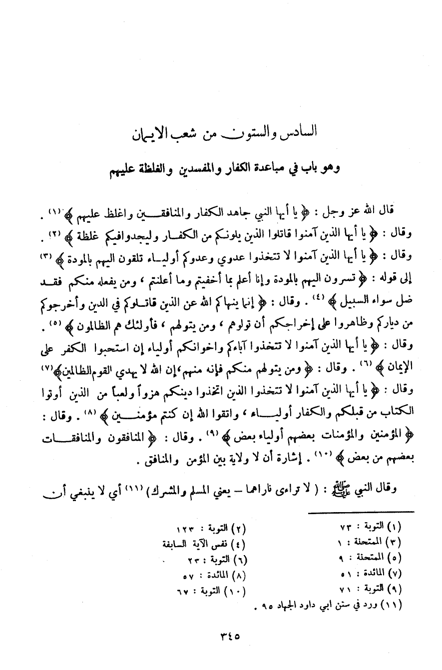 قال الله عز وجل: {يا أيها النبي جاهد الكفار والمنافقين واغلظ عليهم}. وقال: {يا أيها الذين آمنوا قاتلوا الذين يلونكم من الكفار وليجدوا فيكم غلظة}. وقال: {يا أيها الذين آمنوا لا تتخذوا عدوي وعدوكم أولياء تلقون إليهم بالمودة} إلى قوله: {تسرون إليهم بالمودة وأنا أعلم بما أخفيتم وما أعلنتم، ومن يفعله منكم فقد ضل سواء السبيل}. وقال: {إنما ينهاكم الله عن الذين قاتلوكم في الدين وأخرجوكم من دياركم وظاهروا على إخراجكم أن تولوهم، ومن يتولهم، فأولئك هم الظالمون}. وقال: {يا أيها الذين آمنوا لا تتخذوا آباءكم وإخوانكم أولياء إن استحبوا الكفر على الإيمان}. وقال: {ومن يتولهم منكم فإنه منهم، إن الله لا يهدي القوم الظالمين} وقال: {يا أيها الذين آمنوا لا تتخذوا الذين اتخذوا دينكم هزوًا ولعبًا من الذين أوتوا الكتاب من قبلكم والكفار أولياء، واتقوا الله إن كنتم مؤمنين}. وقال: {المؤمنين والمؤمنات بعضهم أولياء بعض}. وقال: {المنافقون والمنافقات بعضهم من بعض}. إشارة أن لا ولاية بين المؤمن والمنافق.