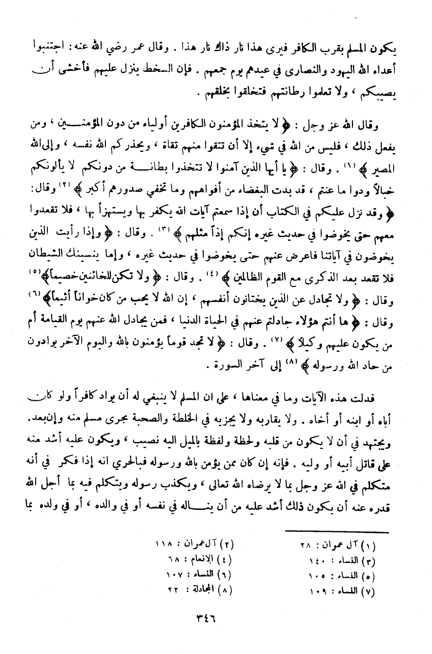 وقال الله عز وجل: {لا يتخذ المؤمنون الكافرين أولياء من دون المؤمنين، ومن يفعل ذلك، فليس من الله في شيء إلا أن تتقوا منهم تقاة، ويحذركم الله نفسه، وإلى الله المصير}. وقال: {يا أيها الذين آمنوا لا تتخذوا بطانة من دونكم لا يألونكم خبالًا ودوا ما عنتم، قد بدت البغضاء من أفواههم وما تخفي صدورهم أكبر} وقال: {وقد نزل عليكم في الكتاب أن إذا سمعتم آيات الله يكفر بها ويستهزأ بها، فلا تقعدوا معهم حتى يخوضوا في حديث غيره إنكم إذًا مثله}. وقال: {وإذا رأيت الذين يخوضون في آياتنا فاعرض عنهم حتى يخوضوا في حديث غيره، وإما ينسينك الشيطان فلا تقعد بعد الذكرى مع القوم الظالمين}. وقال: {ولا تكن للخائنين خصيمًا} وقال: {ولا تجادل عن الذين يختانون أنفسهم، إن الله لا يحب من كان خوانًا أثيمًا} وقال: {ها أنتم هؤلاء جادلتم عنهم في الحياة الدنيا، فمن يجادل الله عنهم يوم القيامة أم من يكون عليهم وكيلًا}. وقال: {لا تجد قومًا يؤمنون بالله واليوم الآخر يوادون من حاد الله ورسوله} إلى آخر السورة.