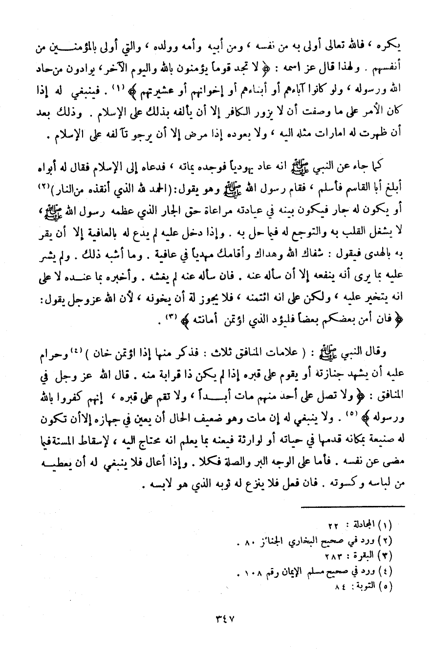 يكره، فالله تعالى أولى به من نفسه، ومن أبيه وأمه وولده، والتي أولى بالمؤمنين من أنفسهم. ولهذا قال عز اسمه: {لا تجد قومًا يؤمنون بالله واليوم الآخر، يوادون من حاد الله ورسوله، ولو كان آباءهم أو أبناءهم أو إخوانهم أو عشيرتهم}. فينبغي له إذا كان الأمر على ما وصفت أن لا يزور الكافر إلا أن يألفه بذلك على الإسلام. وذلك بعد أن ظهرت له أمارات مثله إليه، ولا يعوده إذا مرض إلا أن يرجو تآلفه على الإسلام.