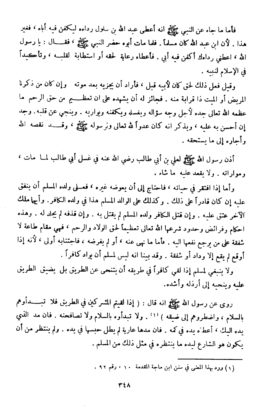 فأما ما جاء عن النبي صلى الله عليه وسلم أنه أعطى عبد الله بن سلول رداءه ليكفن فيه أباه، فغير هذا. لأن ابن عبد الله كان مسلمًا. فلما مات أبوه حضر النبي صلى الله عليه وسلم، فقال: يا رسول الله، أعطني رداءك أكفن فيه أبي. فأعطاه رعاية لحقه أو استطابة لقلبه، وتأكيدًا في الإسلام لنبيه.