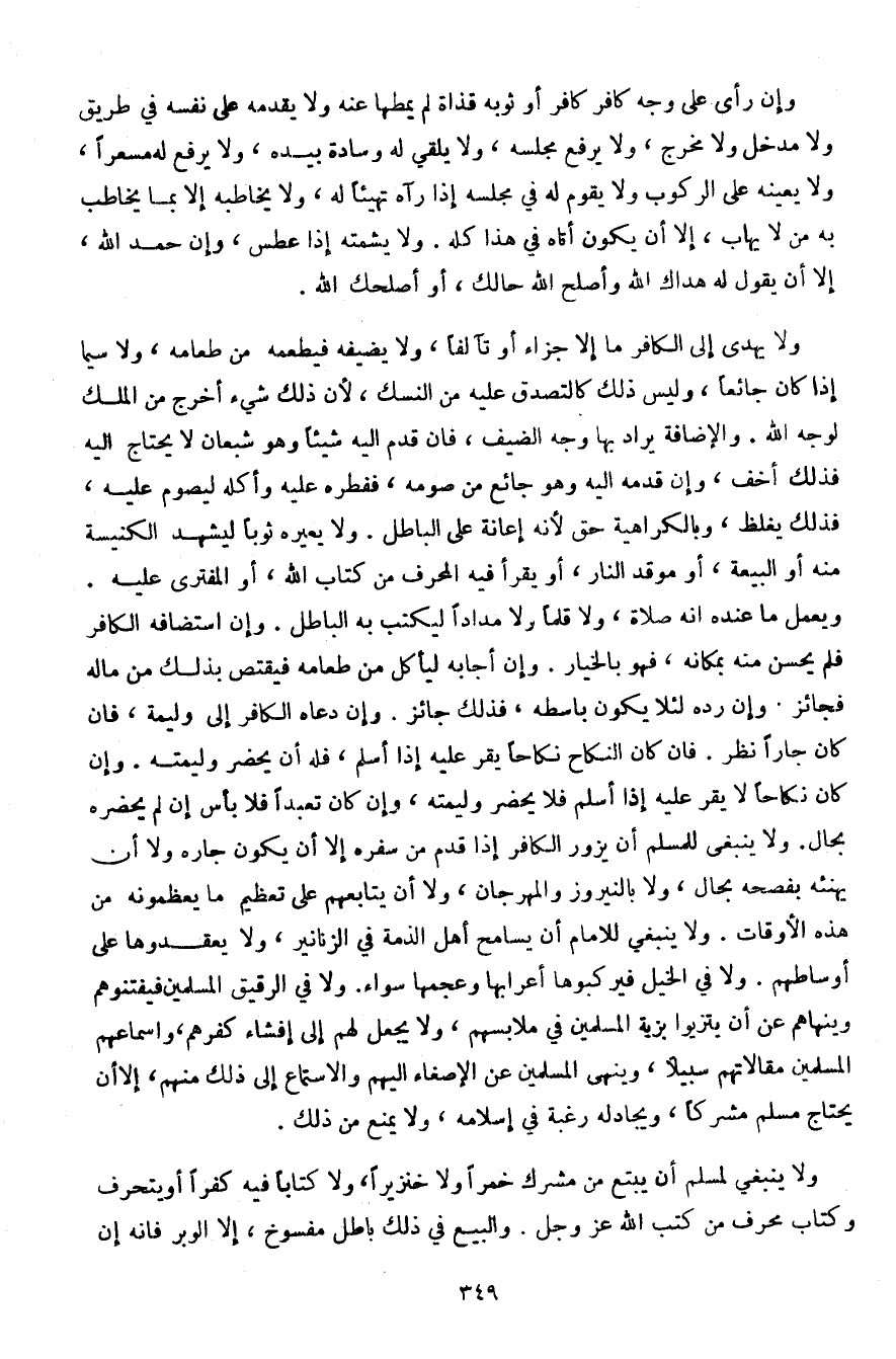 ولا يهدى إلى الكافر ما إلا جزاء أو تآلفًا، ولا يضيفه فيطعمه من طعامه، ولاسيما إذا كان جائعًا، وليس ذلك كالتصدق عليه من النسك، لأن ذلك شيء أخرج من الملك لوجه الله. والإضافة يراد بها وجه الضيف، فإن قدم إليه شيئًا وهو شبعان لا يحتاج إليه فذلك أخف، وإن قدمه إليه وهو جائع من صومه، ففطره عليه وأكله ليصوم عليه، فذلك يغلظ، وبالكراهية حق لأنه إعانة على الباطل. ولا يعيره ثوبًا ليشهد الكنيسة منه أو البيعة، أو موقد النار، أو يقرأ فيه المحرف من كتاب الله، أو المفترى عليه. ويعمل ما عنده أنه صلاة، ولا قلمًا ولا مدادًا ليكتب به الباطل. وإن استضافه الكافر فلم يحسن منه مكانه، فهو بالخيار. وإن أجابه ليأكل من طعامه فيقتص بذلك من ماله فجائز. وإن رده لئلا يكون باسطه، فذلك جائز. وإن دعاه الكافر إلى وليمة، فإن كان جارًا نظر. فإن كان النكاح نكاحًا يقر عليه إذا أسلم، فله أن يحضر وليمته. وإن كان نكاحًا لا يقر عليه إذا أسلم فلا يحضر وليمته، وإن كان تعبدًا فلا بأس إن لم يحضره بحال. ولا ينبغي للمسلم أن يزور الكافر إذا قدم من سفره إلا أن يكون جاره ولا أن يهنئه بفصحه بحال، ولا بالنيروز والمهرجان، ولا أن يتابعهم على تعظيم ما يعظمونه من هذه الأوقات. ولا ينبغي للإمام أن يسامح أهل الذمة في الزنانير، ولا يعقدوها على أوساطهم. ولا في الخيل فيركبوها أعرابها وعجمها سواء. ولا في الرقيق المسلمين فيفتنوهم وينهاهم عن أن يتزيوا بزية المسلمين في ملابسهم، ولا يجعل لهم إلى إفشاء كفرهم، وإسماعهم المسلمين مقالاتهم سبيلًا، وينهى المسلمين عن الإصغاء إليهم والاستماع إلى ذلك مهم، إلا أن يحتاج مسلم مشركًا، ويجادله رغبة في إسلامه، ولا يمنع من ذلك.