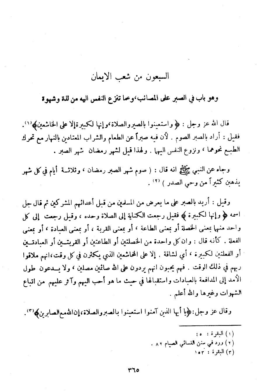 قال الله عز وجل: {واستعينوا بالصبر والصلاة، وإنها لكبيرة إلا على الخاشعين}. فقيل: أراد بالصبر والصوم. لأن فيه صبرًا عن الطعام والشراب المعتادين بالنهار مع تحرك الطبع نحوهما، ونزوع النفس إليها. ولهذا قيل لشهر رمضان شهر الصبر.