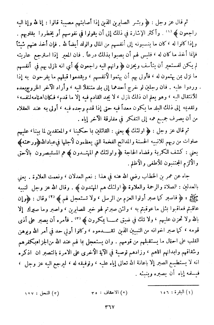 جاء عن عمر بن الخطاب رضي الله عنه في هذا: نعم العدلان، ونعمت العلاوة. يعني بالعدلين: الصلاة والرحمة والعلاوة {أولئك هم المهتدون}. وقال الله عز وجل لنبيه صلى الله عليه وسلم: {فاصبر كما صبر أولوا العزم من الرسل، ولا تستعجل لهم} وقال: {وإن عاقبتم فعاقبوا بمثل ما عوقبتم به، ولئن صبرتم لهو خير للصابرين، واصبر وما صبرك إلا بالله ولا تحزن عليهم، ولا تك في ضيق مما يمكرون}. فأمره أن يصبر على أذى قومه، كما صبر إخوانه من النبيين الذين تقدموه، وكانوا أولي حد في أمر الله ويوهن القلب على احتمال ما يستقبلهم من قومهم. وأن يستعجل بما لهم عنده الله من الجزاء بكفرهم وشقاقهم وأبدانهم أتاهم، وزادهم توصية في الآية الأخرى على الأمرة بالتصبر أن اذكره أنه لا يستطيع الصبر إلا بإعانة الله تعالى إياه عليه، وتوفيقه له، ليرجع إليه عز وجل، فيسلمه إياه أن يصبره وينبئه.
