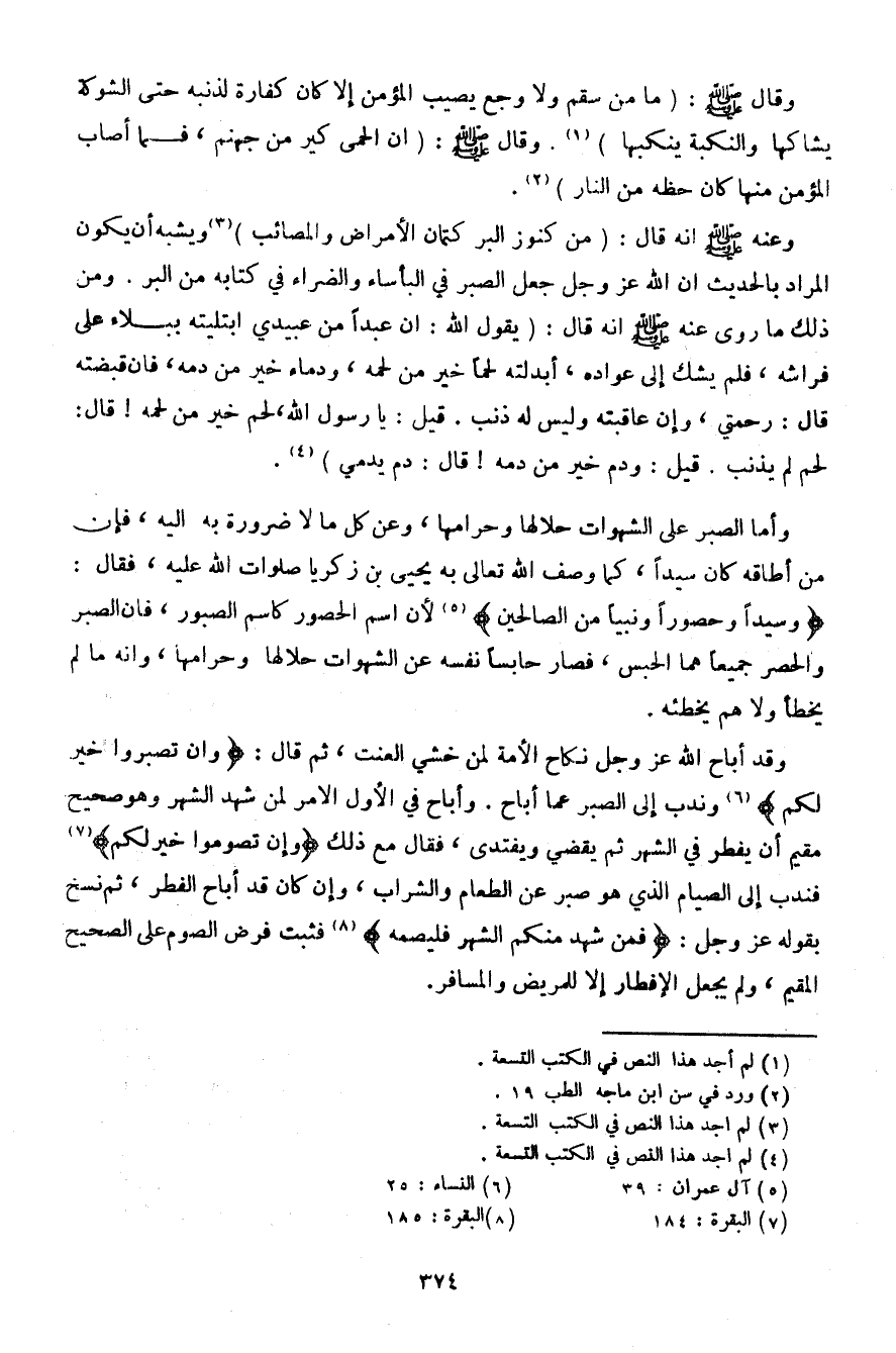وقال صلى الله عليه وسلم: (ما من سقم ولا وجع يصيب المؤمن إلا كان كفارة لذنبه حتى الشوكة يشاكها والنكبة ينكبها). وقال صلى الله عليه وسلم: (إن الحمى كير من جهنم، فما أصاب المؤمن منها كان حظه من النار).