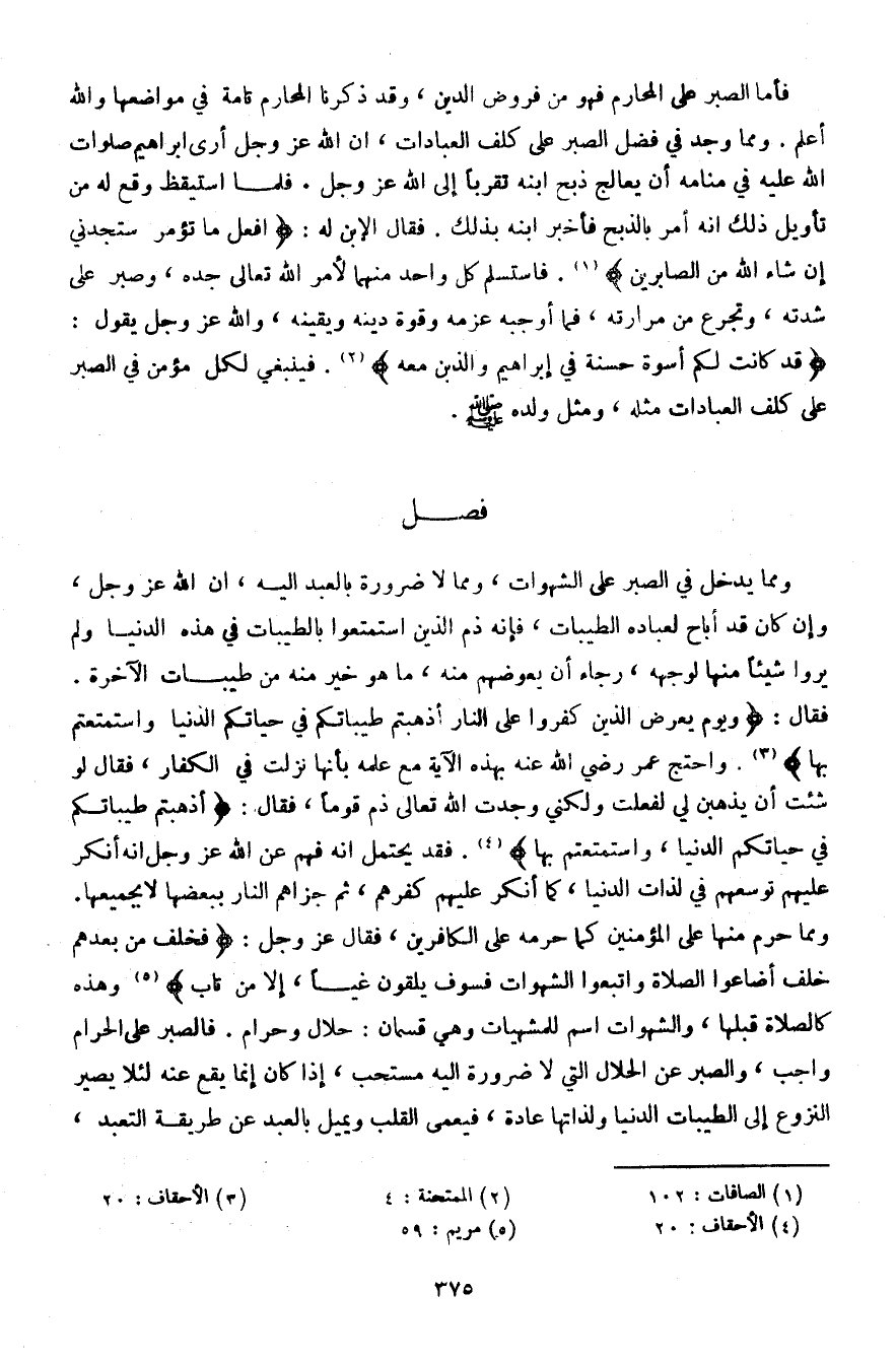 ومما يدخل في الصبر على الشهوات، ومما لا ضرورة بالعبد إليه، إن الله عز وجل، وإن كان قد أباح لعباده الطيبات، فإنه ذم الذين استمتعوا بالطيبات في هذه الدنيا ولم يروا شيئًا منها لوجهه، رجاء أن يعوضهم منه، ما هو خير منه من طيبات الآخرة. فقال: {ويوم يعرض الذين كفروا على النار أذهبتم طيباتكم في حياتكم الدنيا واستمتعتم بها}. واحتج عمر رضي الله عنه بهذه الآية مع علمه بأنها نزلت في الكفار، فقال لو شئت أن يذهبن لي لفعلت ولكني وجدت الله تعالى ذم قومًا، فقال: {أذهبتم طيباتكم في حياتكم الدنيا، واستمتعتم بها}. فقد يحتمل أنه فهم عن الله عز وجل أنه أنكر عليهم توسعهم في لذات الدنيا، كما أنكر عليهم كفرهم، ثم جزاهم النار ببعضها لا بجميعها ومما حرم منها على المؤمنين كما حرمه على الكافرين، فقال عز وجل: {فخلف من بعدهم خلف أضاعوا الصلاة واتبعوا الشهوات فسوف يلقون غيًا، إلا من تاب} وهذه كالصلاة قبلها، والشهوات اسم للمشهيات وهي قسمان: حلال وحرام. فالصبر على الحرام واجب، والصبر عن الحلال التي لا ضرورة إليه مستحب، إذا كان إنما يقع عنه لئلا يصبر النزوع إلى الطيبات الدنيا ولذاتها عادة، فيعمى القلب ويميل بالعبد عن طريقة التعبد،