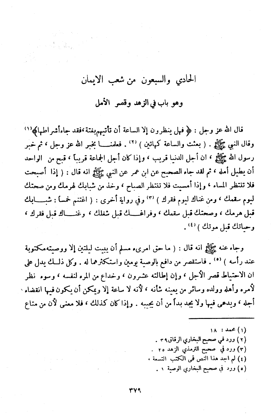قال الله عز وجل: {فهل ينظرون إلى الساعة أن تأتيهم بغتة، فقد جاء أشراطها} وقال النبي صلى الله عليه وسلم. (بعثت والساعة كهاتين). فعلمنا بخبر الله عز وجل، ثم خبر رسول الله صلى الله عليه وسلم، أن أجل الدنيا قريب، وإذا كان أجل الجماعة قريبًا، قبح من الواحد أن يطيل أمله، ثم لقد جاء الصحيح عن ابن عمر عن النبي صلى الله عليه وسلم أنه قال: (إذا أصبحت فلا تنتظر المساء، وإذا أمسيت فلا تنتظر الصباح، وخذ من شبابك لهرمك ومن صحتك ليوم سقمك، ومن غناك ليوم فقرك) وفي رواية أخرى: (اغتنم خمسًا: شبابك قبل هرمك، وصحتك قبل سقمك، وفراغك قبل شغلك، وغناك قبل فقرك، وحياتك قبل موتك).