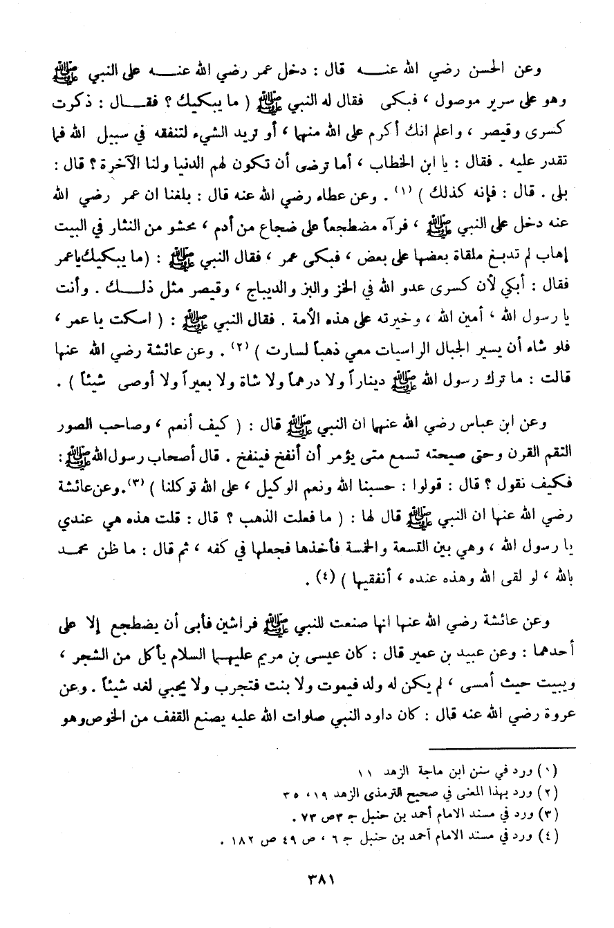 وعن عائشة رضي الله عنها أنها صنعت للنبي صلى الله عليه وسلم فراشين فأبى أن يضطجع إلى على أحدهما: وعن عبيد بن عمير قال: كان عيسى بن مريم عليهما السلام يأكل من الشجر، ويبيت حيث أمسى، لم يكن له ولد فيموت ولا بنت فتجرب ولا يجبي لغد شيئًا. وعن عروة رضي الله عنه قال: كان دادود النبي صلوات الله عليه يصنع القفف من الخوص وهو