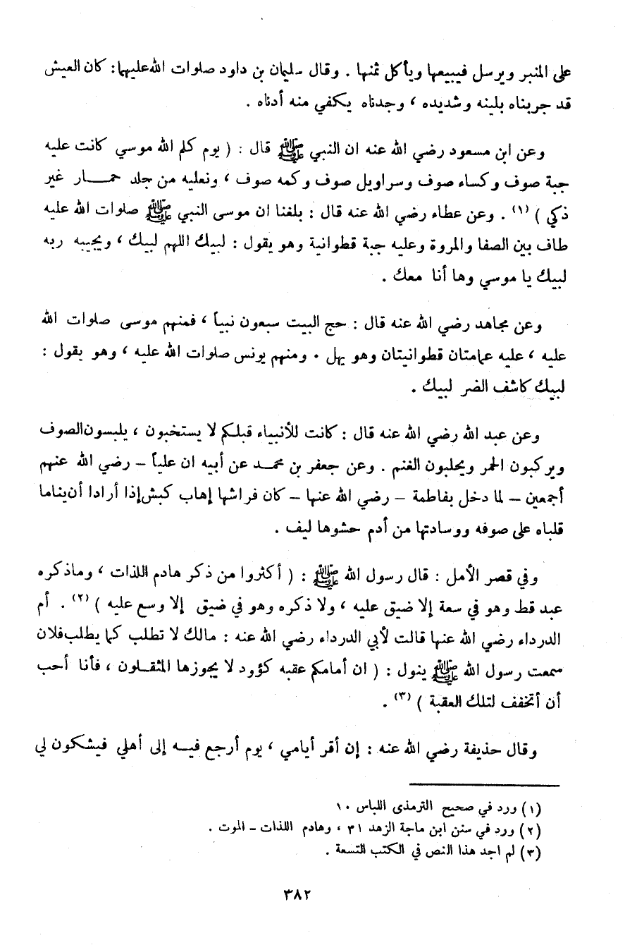 وعن ابن مسعود رضي الله عنه أن النبي صلى الله عليه وسلم قال: (يوم كلم الله موسى كانت عليه جبة صوف وكساء صوف وسراويل صوف وكمه صوف، ونعليه من جلد حمار غير ذكي). وعن عطاء رضي الله عنه قال: بلغنا أن موسى النبي صلى الله عليه وسلم صلوات الله عليه طاف بين الصفا والمروة وعليه جبة قطوانية وهو يقول: لبيك اللهم لبيك، يجيبه ربه لبيك يا موسى وها أنا معك.