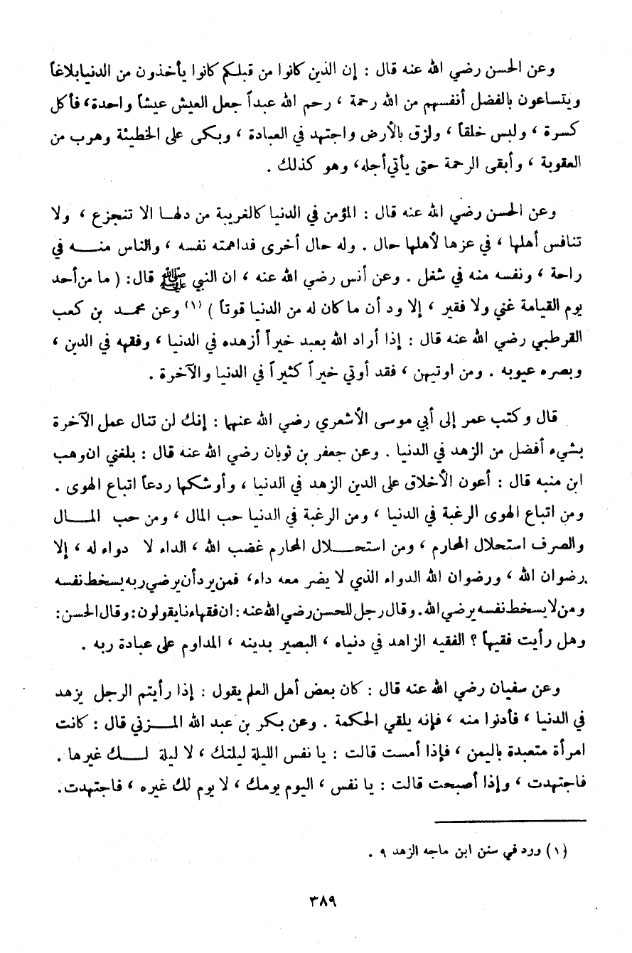 وعن الحسن رضي الله عنه قال: المؤمن في الدنيا كالغريبة من دلها ألا تنجزع، ولا تنافس أهلها، في عزها لأهلها حال. وله حال أخرى فداهمته نفسه، والناس منه في راحة، ونفسه منه في شغل. وعن أنس رضي الله عنه، أن النبي صلى الله عليه وسلم قال: (ما من أحد يوم القيامة غني ولا فقير، إلا ود أن ما كان له من الدنيا قوتًا) وعن محمد بن كعب القرطبي رضي الله عنه قال: إذا أراد الله بعبد خيرًا أزهده في الدنيا، وفقهه في الدين، وبصره عيوبه. ومن أوتيهن، فقد أوتي خيرًا كثيرًا في الدنيا والآخرة.