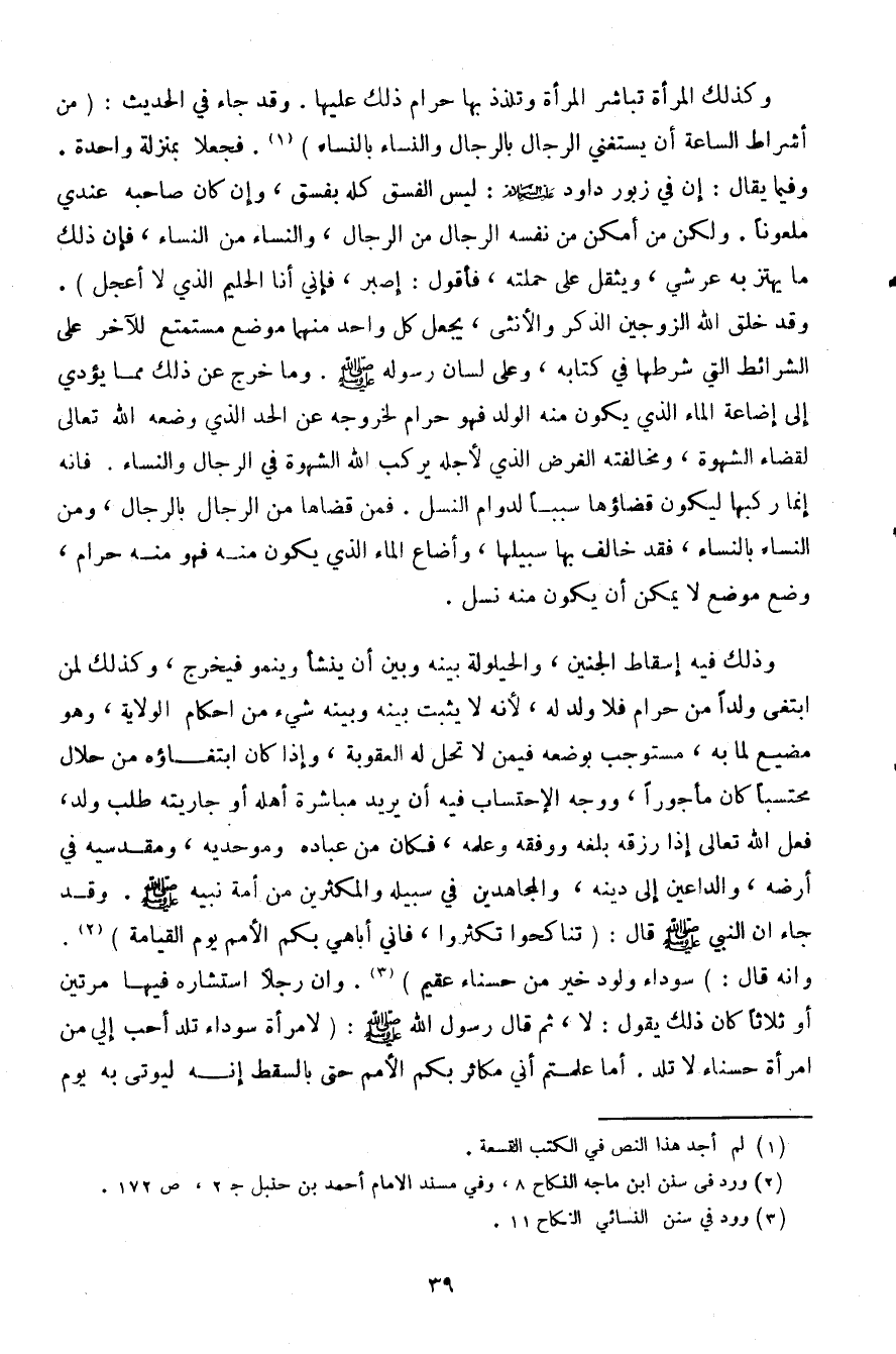وذلك فيه إسقاط الجنين، والحيلولة بينه وبين أن ينشأ وينمو فيخرج، وكذلك لمن ابتغى ولدا من حرام فلا ولد له، لأنه لا يثبت بينه وبينه شيء من أحكام الولاية، وهو مضيع لما به، مستوجب بوضعه فيمن لا تحل له العقوبة، وإذا كان ابتغاؤه من حلال محتسبا كان مأجورا، ووجه الاحتساب فيه أن يريد مباشرة أهله أو جاريته طلب ولد، فعل الله تعالى إذا رزقه بلغه ووفقه وعلمه، فكان من عباده وموحديه، ومقدسيه في أرضه، والداعين إلى دينه، والمجاهدين في سبيله والمكثرين من أمة نبيه صلى الله عليه وسلم. وقد جاء أن النبي صلى الله عليه وسلم قال: (تناكحوا تكثروا، فإني أباهي بكم الأمم يوم القيامة). وأنه قال: (سوداء ولود خير من حسناء عقيم). وأن رجلا استشاره فيها مرتين أو ثلاثا كان ذلك يقول: لا، ثم قال رسول الله صلى الله عليه وسلم: (لامرأة سوداء تلد أحب إلي من امرأة حسناء لا تلد. أما علمتم أني مكاثر بكم الأمم حتى بالسقط إنه ليؤتي به يوم