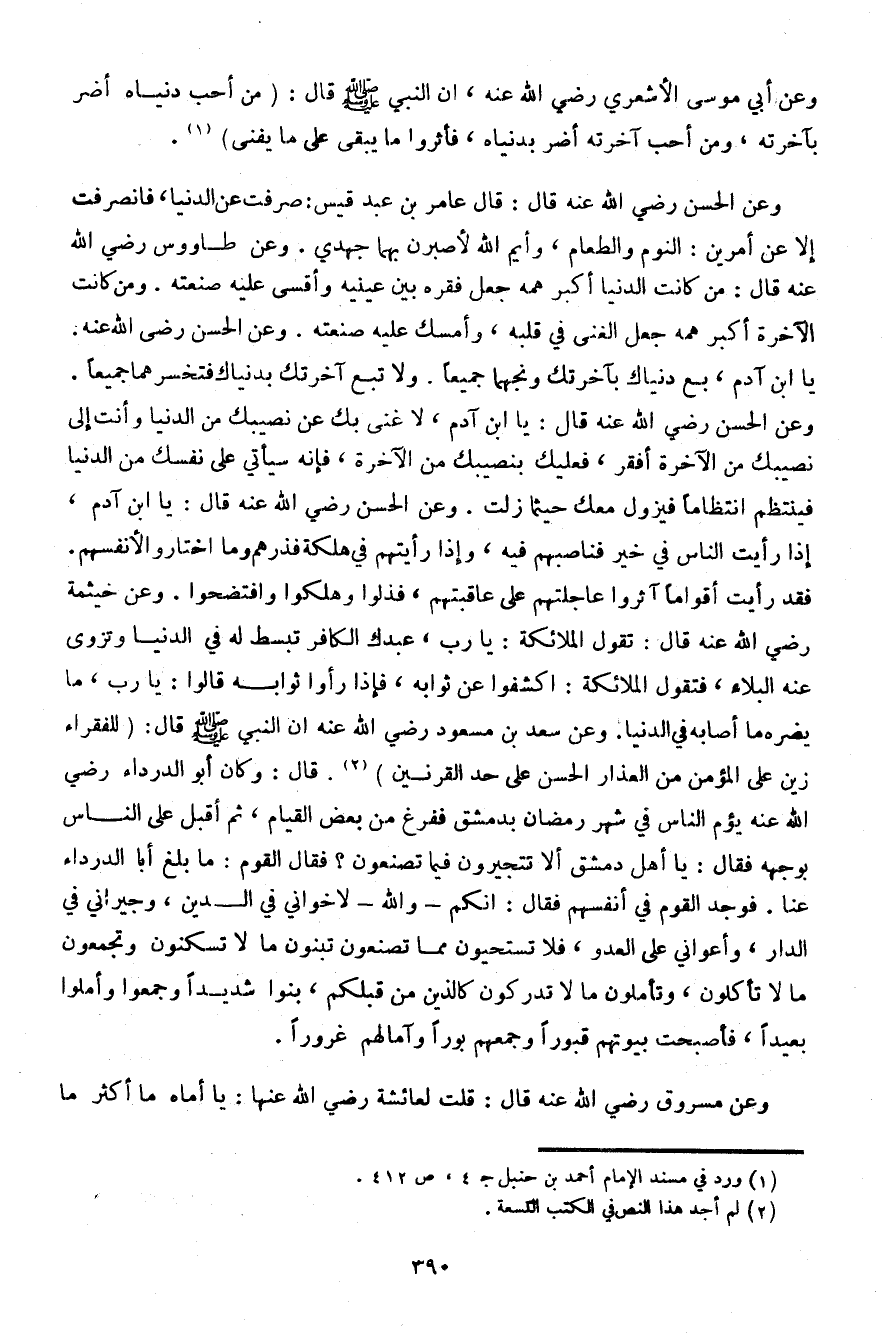 وعن الحسن رضي الله عنه قال: قال عامر بن عبد قيس: صرفت عن الدنيا، فانصرفت إلا عن أمرين: النوم والطعام، وأيم الله لأصبرن بهما جهدي. وعن طاووس رضي الله عنه قال: من كانت الدنيا أكبر همه جعل فقره بين عينيه وأقسى عليه صنعته. ومن كانت الآخرة أكبر همه جعل الغنى في قلبه، وأمسك عليه صنعته. وعن الحسن رضي الله عنه. يا ابن آدم، بع دنياك بآخرتك ونجهما جميعًا. ولا تبع آخرتك بدنياك فتخسرهما جميعًا. وعن الحسن رضي الله عنه قال: يا ابن آدم، لا غنى بك عن نصيبك من الدنيا وأنت إلى نصيبك من الآخرة أفقر، فعليك بنصيبك من الآخرة، فإنه سيأتي على نفسك من الدنيا فينتظم انتظامًا فيزول معك حيثما زلت. وعن الحسن رضي الله عنه قال: يا ابن آدم، إذا رأيت الناس في خير فناصبهم فيه، وإذا رأيتهم في هلكة فذرهم وما اختاروا لأنفسهم. فقد رأيت أقوامًا آثروا عاجلتهم على عاقبتهم، فذلوا وهلكوا وافتضحوا. وعن خيثمة رضي الله عنه قال: تقول الملائكة: يا رب، عبدك الكافر تبسط له في الدنيا وتزوي عنه البلاء، فتقول الملائكة: اكشفوا عن ثوابه، فإذا رأوا ثوابه قالوا: يا رب، ما يضره ما أصابه في الدنيا. وعن سعد بن مسعود رضي الله عنه أن النبي صلى الله عليه وسلم قال: (للفقراء زين على المؤمن من العذار الحسن على حد القرنين). قال: وكان أبو الدرداء رضي الله عنه يؤم الناس في شهر رمضان بدمشق ففرغ من بعض القيام، ثم أقبل على الناس بوجه فقال: يا أهل دمشق ألا تتجيرون فيما تصنعون؟ فقال القوم: ما بلغ أبا الدرداء عنا. فوجد القوم في أنفسهم فقال: إنكم- والله- لأخواني في الدين، وجيراني في الدار، وأعواني على العدو، فلا تستحيون مما تصنعون تبنون ما لا تسكنون وتجمعون ما لا تأكلون، وتأملون ما لا تدركون كالذين من قبلكم، بنوا شديدًا وجمعوا وأملوا بعيدًا، فأصبحت بيوتهم قبورًا وجمعهم بورًا وآمالهم غرورًا.