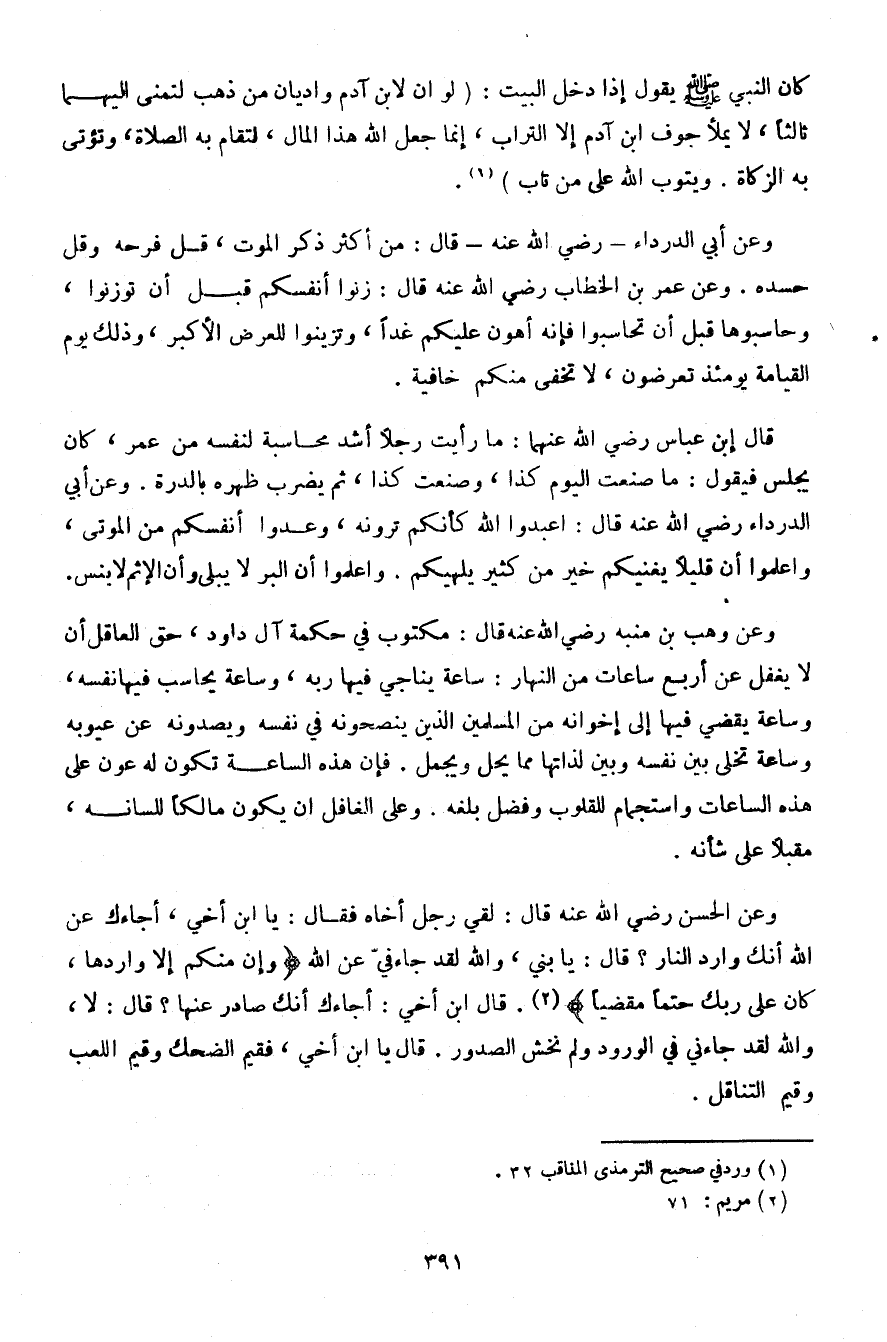قال ابن عباس رضي الله عنهما: ما رأيت رجلًا أشد محاسبة لنفسه من عمر، كان يجلس فيقول: ما صنعت اليوم كذا، وصنعت كذا، ثم يضرب هره بالدرة. وعن أبي الدرداء رضي الله عنه قال: اعبدوا الله كأنكم تروه، وعدوا أنفسكم من الموتى، واعلموا أن قليلًا يغنيكم خير من كثير يلهيكم. واعلموا أن البر لا يبلى وأن الإثم لا ينس.