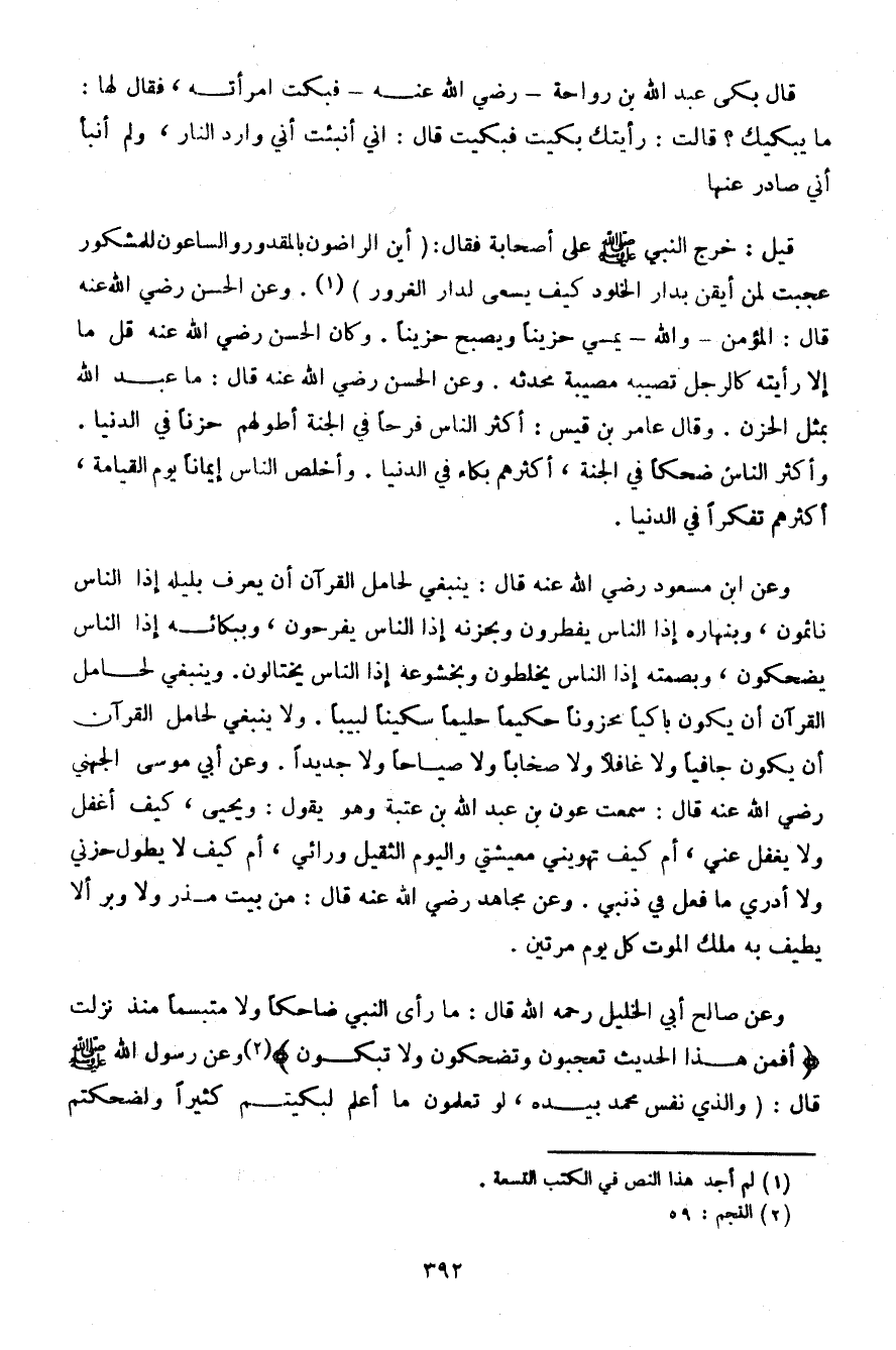 وعن صالح أبي الخليل رحمه الله قال: ما رأى النبي ضاحكًا ولا متبسمًا منذ نزلت {أفمن هذا الحديث تعجبون وتضحكون ولا تبكون} وعن رسول الله صلى الله عليه وسلم قال: (والذي نفس محمد بيده، لو تعلمون ما أعلم لبكيتم كثيرًا ولضحكتم