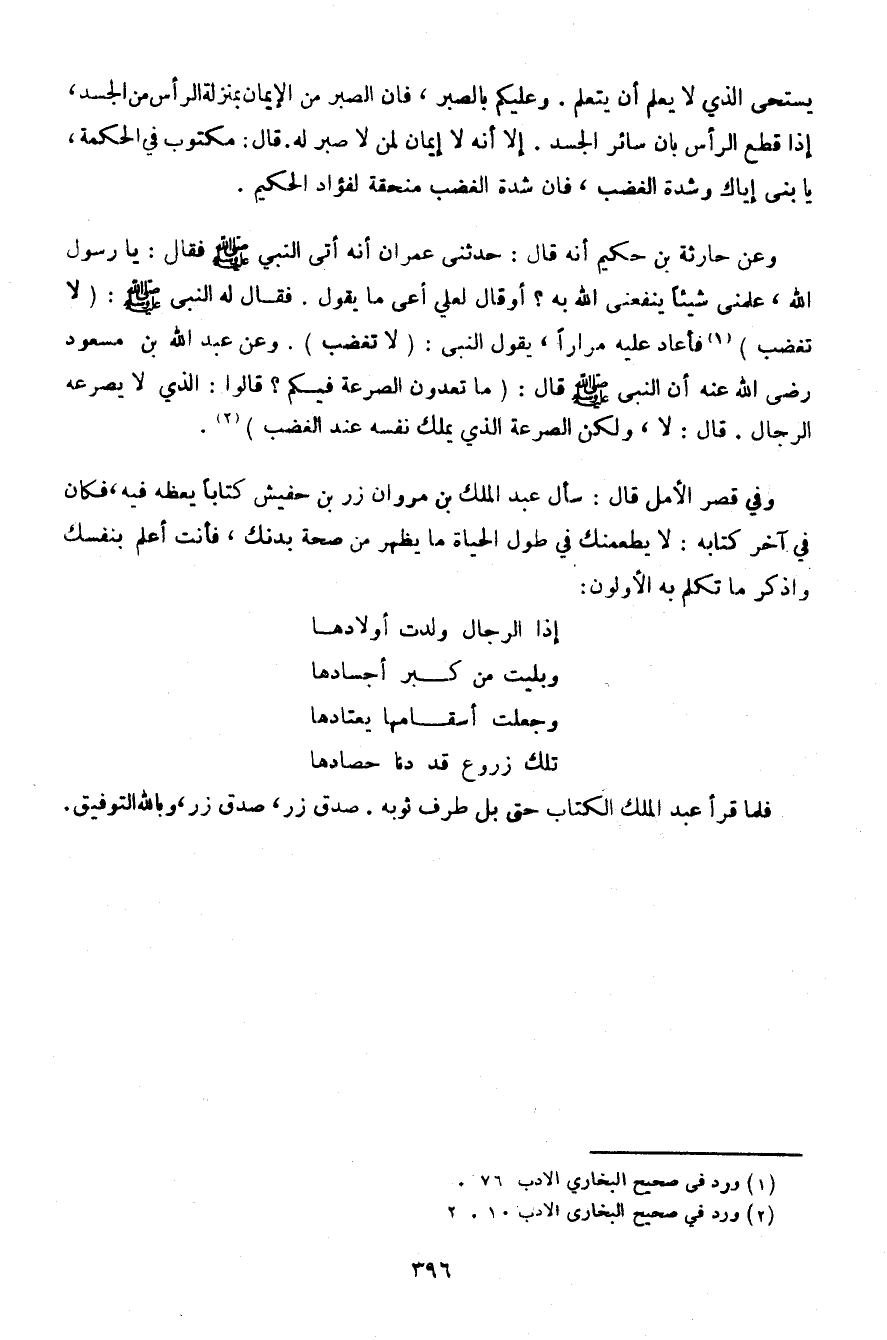 وعن حارثة بن حكيم أنه قال: حدثني عمر أن أنه أتى النبي صلى الله عليه وسلم فقال: يا رسول الله، علمني شيئًا ينفعني الله به؟ أو قال لعلي أعلى ما بقول. فقال له النبي صلى الله عليه وسلم: (لا تغضب) فأعاد عليه مرارًا، يقول النبي: (لا تغضب). وعن عبد الله بن مسعود رضي الله عنه أن النبي صلى الله عليه وسلم قال: (ما تعدون الصرعة فيكم؟ قالوا: الذي لا يصرعه الرجال. قال: لا، ولكن الصرعة الذي يملك نفسه عند الغضب).