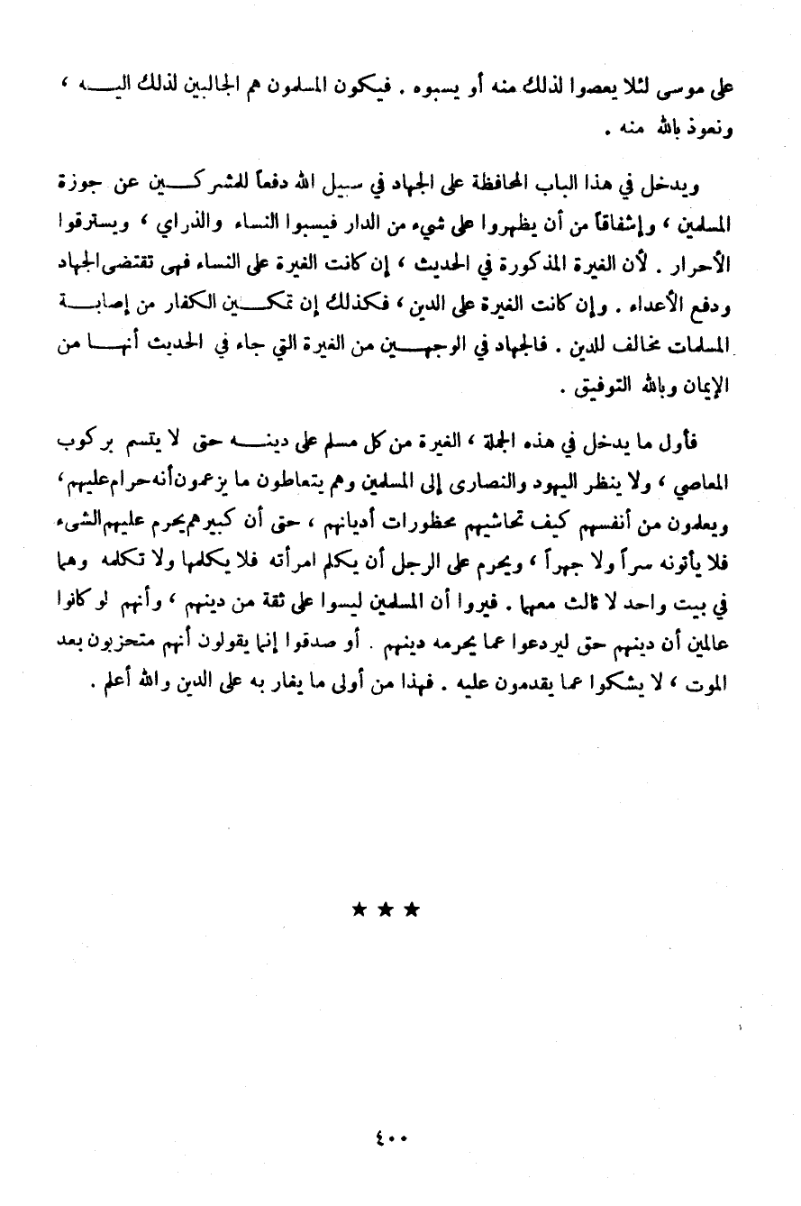 ويدخل في هذا الباب المحافظة على الجهاد في سبيل الله دفعًا للمشركين عن جوزة المسلمين، وإشفاقًا من أن يظهروا على شيء من الدار فيسبوا النساء والذراي، ويسترقوا الأحرار. لأن الغيرة المذكورة في الحديث، إن كانت الغيرة على النساء فهي تقتضي الجهاد ودفع الأعداء. وإن كانت الغيرة على الدين، فكذلك إن تمكين الكفار من إصابة المسلمات مخالف للدين. فالجهاد في الوجهين من الغيرة التي جاء في الحديث أنها من الإيمان وبالله التوفيق.