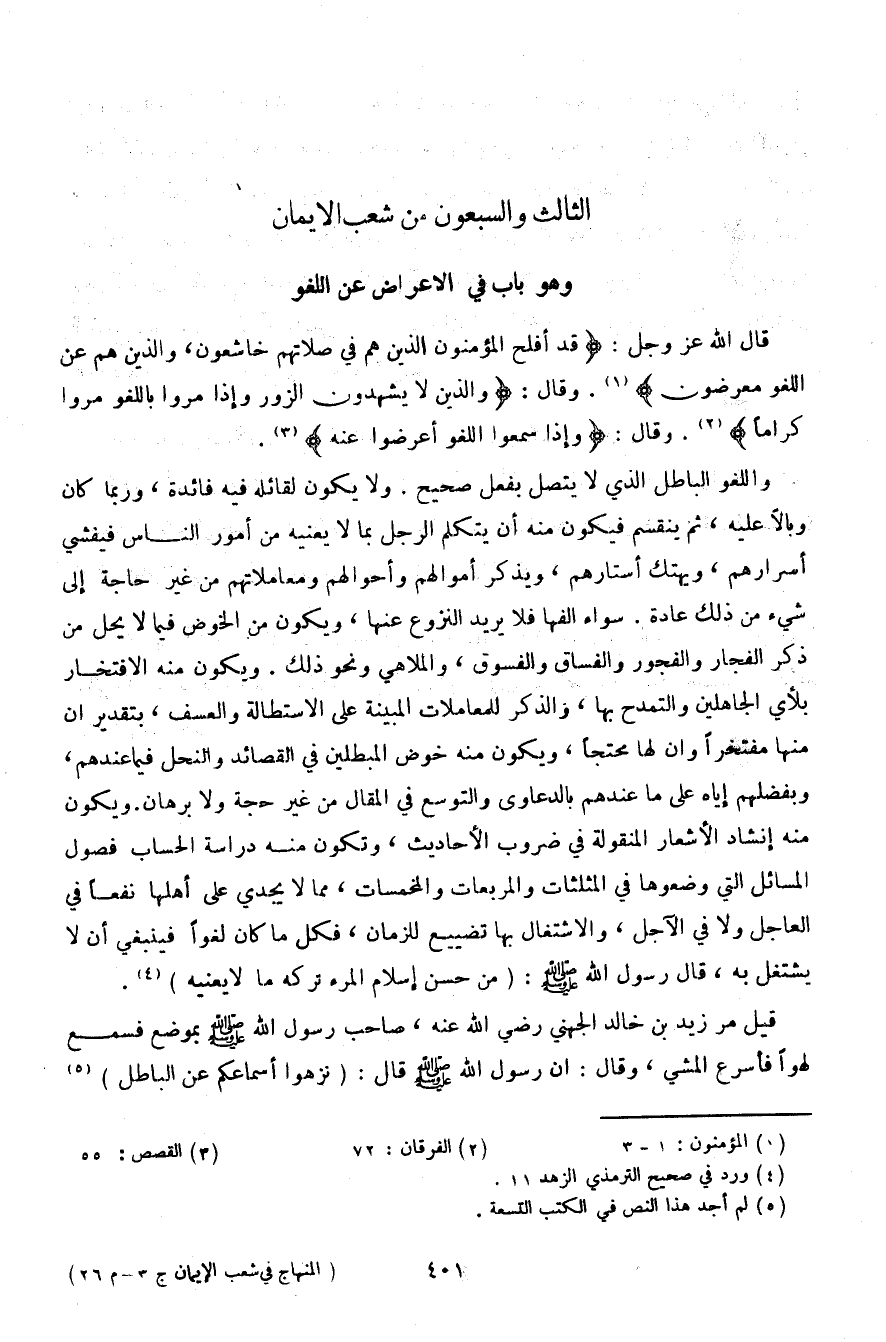 قال الله عز وجل: {قد أفلح المؤمنون الذين هم في صلاتهم خاشعون، والذين هم عن اللغو معرضون}. وقال: {والذين لا يشهدون الزور وإذا مروا باللغو مروا كرامًا}. وقال: {وإذا سمعوا اللغو أعرضوا عنه}.