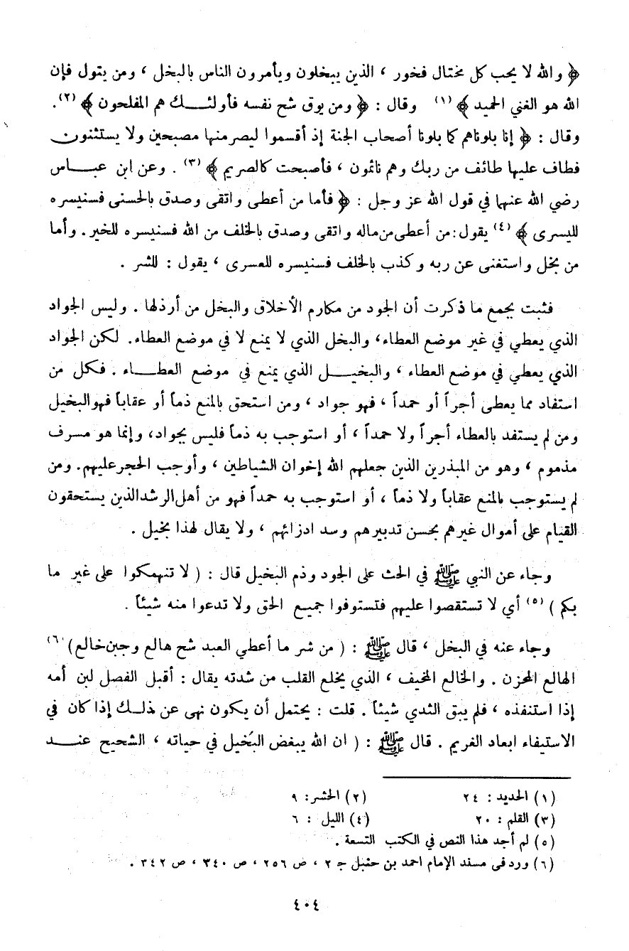 {والله لا يحب كل مختال فخور، الذين يبخلون ويأمرون الناس بالبخل، ومن يتول فإن الله هو الغني الحميد} وقال: {ومن يوق شح نفسه فأولئك هم المفلحون}. وقال: {إنا بلوناهم كما بلونا أصحاب الجنة إذا أقسموا ليصرمنها مصبحين ولا يستثنون فطاف عليها طائف من ربك وهم نائمون، فأصبحت كالصريم}. وعن ابن عباس رضي الله عنهما في قول الله عز وجل: {فأما من أعطى واتقى وصدق بالحسنى فسنيسره لليسرى} يقول: من أعطى من ماله واتقى وصدق بالخلف من الله فسنيسره للخير. وأما من بخل واستغنى عن ربه وكذب بالخلف فسنيسره للعسرى، يقول: للشر.