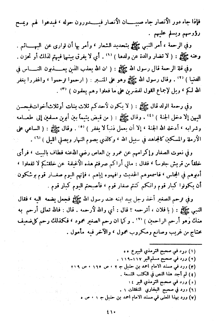 وفي ترحم الصغير أخذ رجل بيد ابنه عند رسول الله صلى الله عليه وسلم فجعل يضمه إليه، فقال النبي صلى الله عليه وسلم: (يا فلان، أترحمه؟ قال: أي والله لأرحمه. قال: فالله تعالى أرحم به منك وهو ارحم الراحمين). وكما أن رحم الصغير محمود، فكذلك رحم كل ضعيف محتاج من غريب وصانع ومكروب محمول، والآخر فيه مأمول.