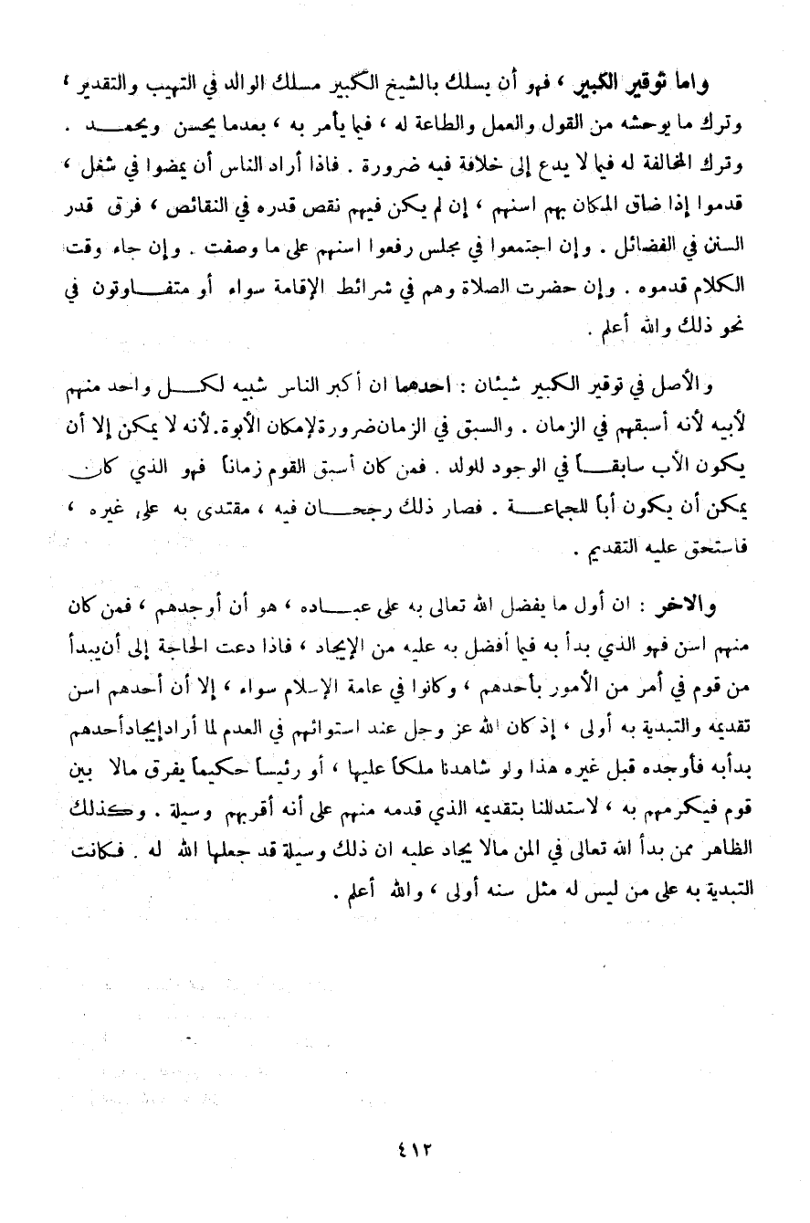 وأما توقير الكبير، فهو أن يسلك بالشيخ الكبير مسلك الوالد في التهيب والتقدير، وترك ما يوحشه من القول والعمل والطاعة له، فيما يأمر به، بعدما يحسن ويحمد. وترك المخالفة له فيما لا يدع إلى خلافة فيه ضرورة. فإذا أراد الناس أن يمضوا في شغل، قدموا إذا ضاق المكان بهم أسنهم، إن لم يكن فيهم نقص قدره في النقائض، فرق قدر السنن في الفضائل. وإن اجتمعوا في مجلس رفعوا أسنهم على ما وصفت. وإن جاء وقت الكلام قدموه. وإن حضرت الصلاة وهم في شرائط الإقامة سواء أو متفاوتون في نحو ذلك والله أعلم.