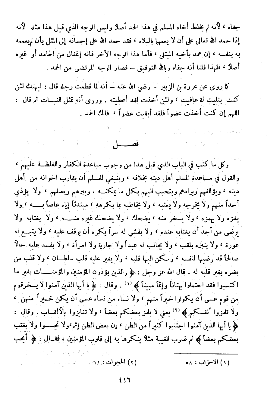 وكل ما كتب في الباب الذي قبل هذا من وجوب مباعدة الكفار والغلظة عليهم، والقول في مساعدة المسلم أهل دينه بخلافه، وينبغي للمسلم أن يقارب إخوانه من أهل دينه، ويؤالفهم ويوادهم ويتحبب غليهم بكل ما يمكنه، ويبرهم ويصلهم، ولا يؤذي أحدًا منهم ولا يخرجه ولا يعتبه، ولا يخاطبه بما يكرهه، مبتدئًا إياه غاصًا به، ولا يلمزه ولا يهمزه، ولا يسخر منه، يضحك، ولا يضحك غيره منه، ولا يغتابه ولا يرضى من أحد أن يغتابه عنده، ولا يفشي له سرًا يكره أن يوقف عليه، ولا يتبع له عورة، ولا ينبزه بلقب، ولا يجانب له عبدًا ولا جارية ولا امرأة، ولا يفسد عليه حالًا صالحًا قد رضيها لنفسه، وسكن إليها قلبه، ولا يغير عليه قلب سلطن، ولا قلب من يضره بغير قلبه له. قال الله عز وجل: {والذين يؤذون المؤمنين والمؤمنات بغير ما اكتسبوا فقد احتملوا بهتانًا وإثمًا مبينًا}. وقال: {يا أيها الذين آمنوا لا يسخر قوم من قوم عسى أن يكونوا خيرًا منهم، ولا نساء من نساء عسى أن يكن خيرًا منهن، ولا تلمزوا أنفسكم} يعني لا يلمز بعضكم بعضًا، ولا تنابزوا بالألقاب. وقال: {يا أيها الذين آمنوا اجتنبوا كثيرًا من الظن، إن بعض الظن إثم، ولا تجسسوا ولا يغتب بعضكم بعضًا} ثم ضرب للغيبة مثلًا ينكرها به إلى قلوب المؤمنين، فقال: {أيحب