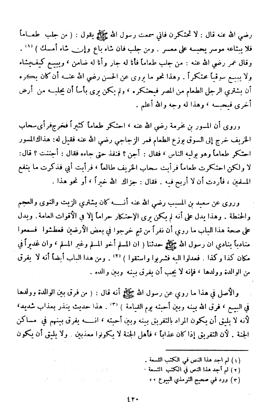 وروى عن سعيد بن المسيب رضي الله عنه أنه كان يشتري الزيت والنوى والعجم والحنطة. وهذا يدل على أنه لم يكن يرى الاحتكار حرامًا إلا في الأقوات العامة. ويدل على صحة هذا الباب ما روي أن نفرًا من تيم خرجوا في بعض الأرضين فعطشوا فسمعوا مناديًا ينادي أن رسول الله صلى الله عليه وسلم حدثنا (إن المسلم أخو المسلم وغير المسلم، وإن غديرًا في مكان كذا وكذا. فعدلوا إليه فشربوا واستقوا). ومن هذا الباب أيضًا أنه لا يفرق من الوالدة وولدها، فإنه لا يجب أن يفرق بينه وبين والده.