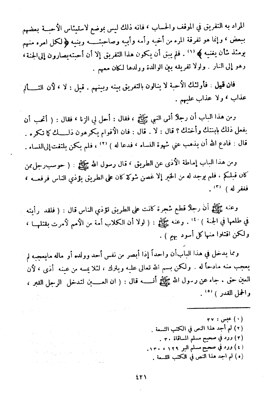 وعنه صلى الله عليه وسلم أن رجلًا قطع شجرة كانت على الطريق تؤذي الناس قال: (فلقد رأيته في طلعها في الجنة). وعنه صلى الله عليه وسلم: (لولا أن الكلاب أمة من الأمم لأمرت بقتلها، ولكن اقتلوا منها كل أسود بهيم).