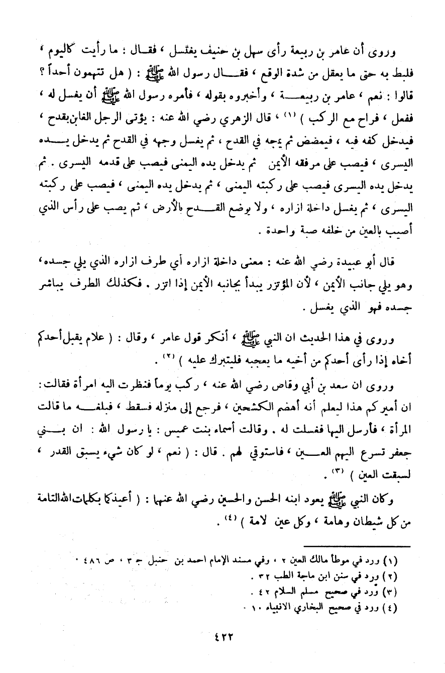 وروى أن سعد بن أبي وقاص رضي الله عنه، ركب يومًا فنظرت إليه امرأة فقالت: إن أميركم هذا ليعلم أنه أهضم الكشحين، فرجع إلى منزله فسقط، فبلغه ما قالت المرأة، فأرسل إليها فغسلت له. وقالت أسماء بنت عميس: يا رسول الله: إن بني جعفر تسرع إليهم العين، فاستوقي لهم. قال: (نعم، لو كان شيء يسبق القدر، لسبقت العين).