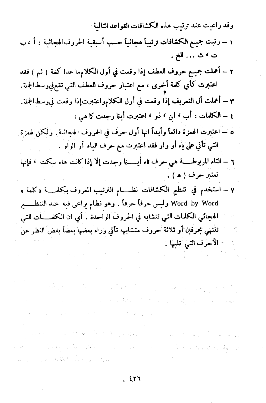 7 - استخدم في تنظيم الكشافات نظام الترتيب المعروف بكلمة "كلمة" Word by Word وليس حرفًا حرفًا، وهو نظام يراعى فيه عند التنظيم الهجائي الكلمات التي تتشابه في الحروف الواحدة. أي أن الكلمات التي تنتهي بحرفين أو ثلاثة حروف متشابهة تأتي وراء بعضها بعضًا بغض النظر عن الأحرف التي تليها.