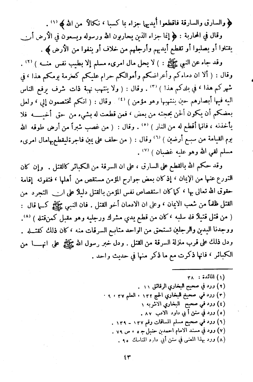 وقد حكم الله بالقطع على السارق، على أن السرقة من الكبائر كالقتل، وإن كان التورع عنها من الإيمان، إذ كان بعض جوارح المؤمن مستقص من أهلها، فتفوته إقامة حقوق الله تعالى بها، كما كان استقصاص نفس المؤمن بالقتل دليلا على ان التجرد من القتل ظلما من شعب الإيمان، وعلى أن الإدمان اخو القتل. فإن النبي صلى الله عليه وسلم كما قال: (من قتل قتيلا فله سلبه، كان من قطع يدي مشرك ورجليه وهو مقبل كمن قتله). ووجدنا اليدين والرجلين تستحق من الواحد متابع السرقات منه، كان ذلك كقتله. ودل ذلك على قرب منزلة السرقة من القتل. ودل خبر رسول الله صلى الله عليه وسلم على أنها من الكبائر، فإنها ذكرت مع ما ذكر منها في حديث واحد.